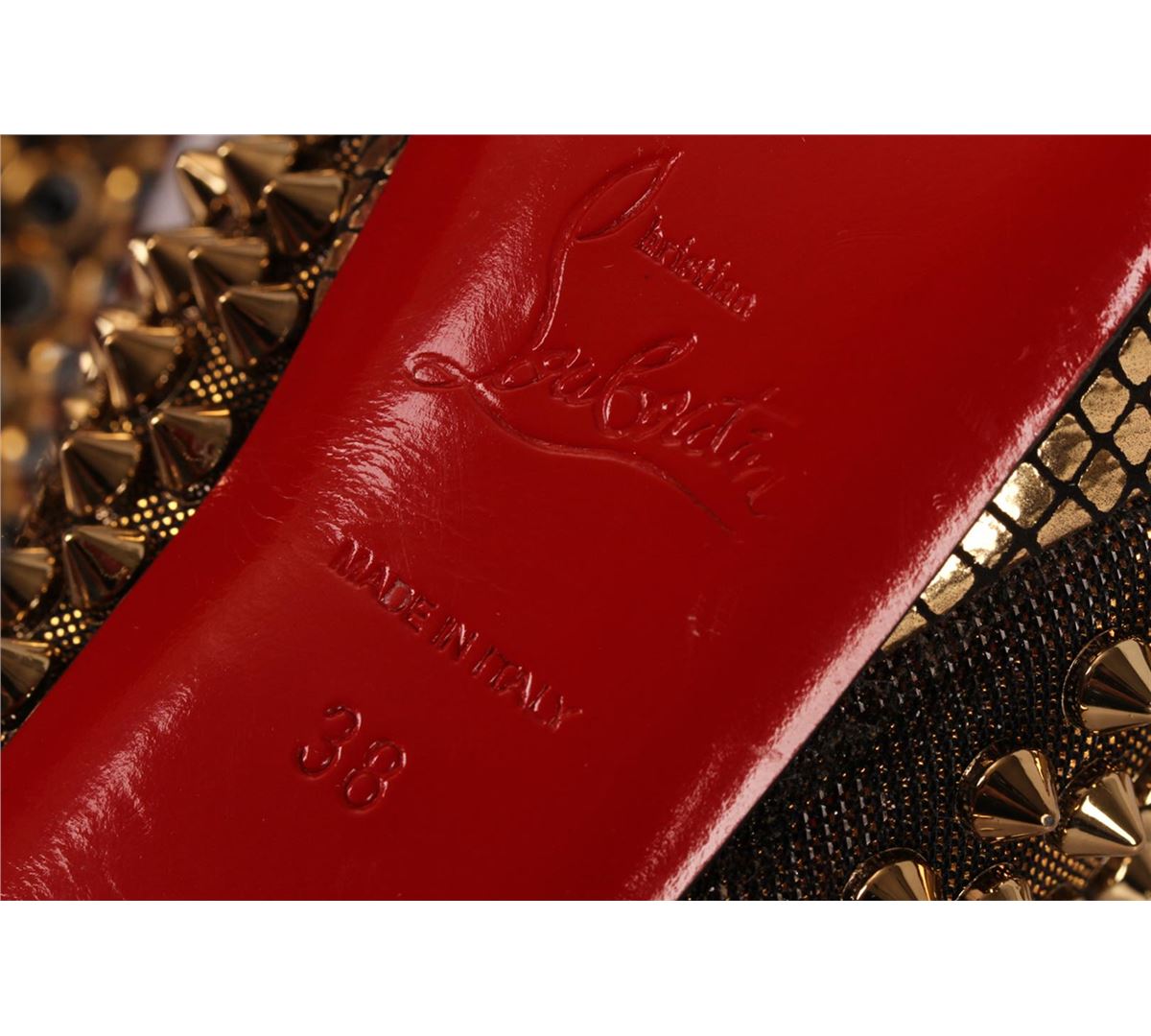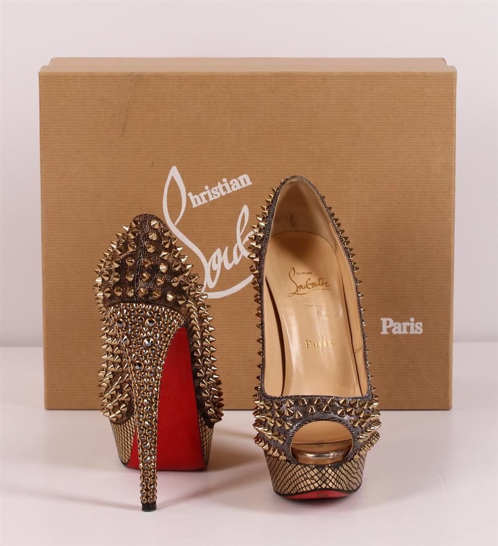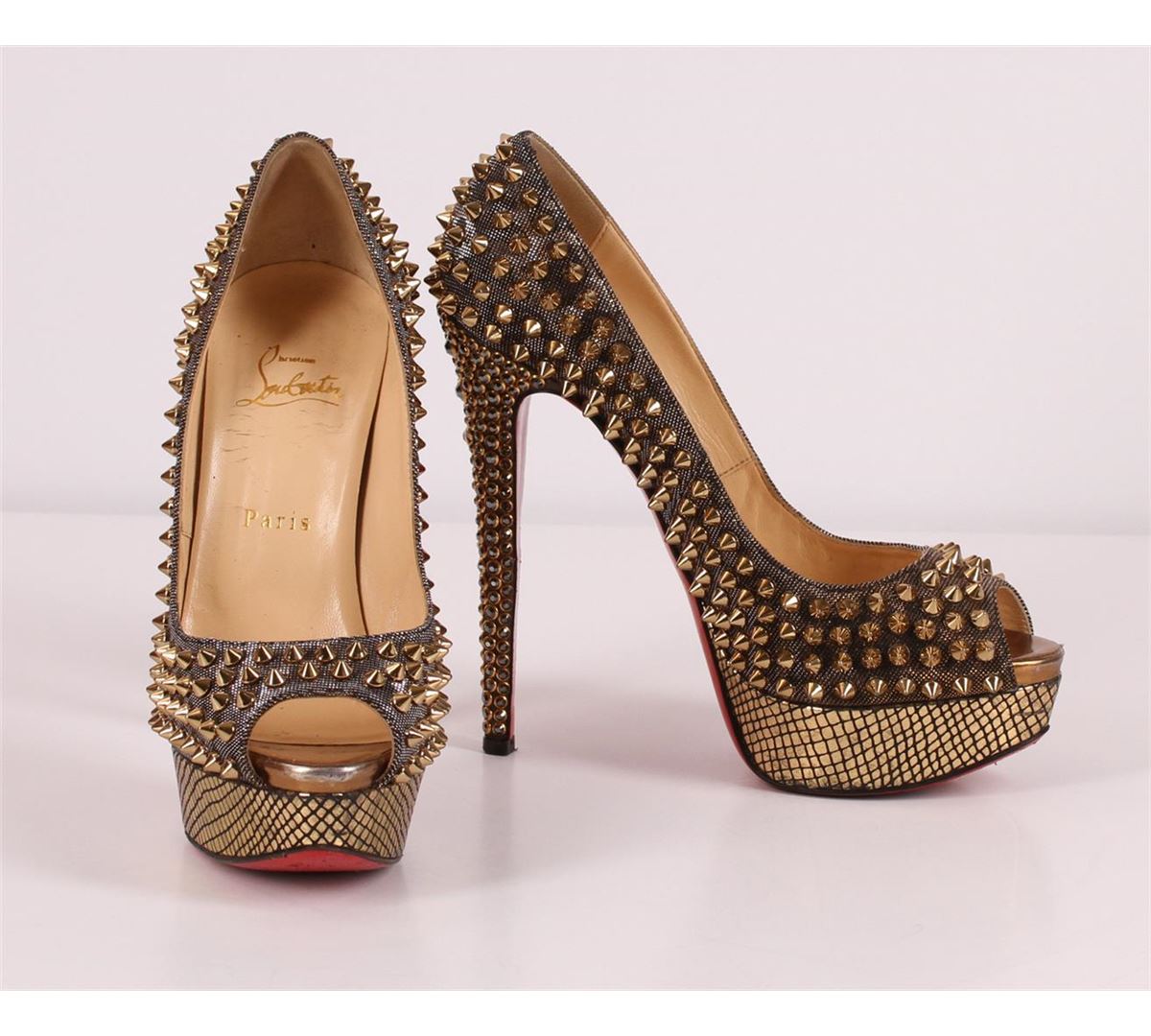 100% Authentic Christian Louboutin Gold Spike Lady Peep Strass High Heels. Perhaps one of the most sought after Christian Louboutin shoes, these Lady Peep Spikes 150 are edgy and luxurious. They feature the classic peep toe silhouette covered with metallic hematite lame and topped off with golden spiked studs. Christian Louboutin has been quoted saying that he wants to "make shoes that are like jewels", and by adding tons of sparkling stones to the heels of these Lady Peep pumps he has achieved just that! They truly are drool worthy. These shoes are in good pre-loved condition. The soles show some wear and there are a few minor scuff marks around the shoe and slight discoloration at the toes. Shoe size is European 38 which fits like a US size 7-7.5.