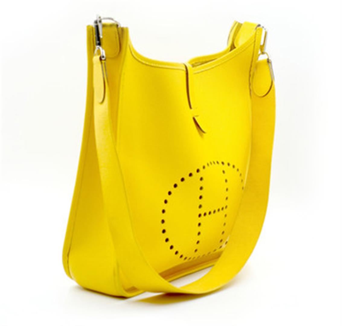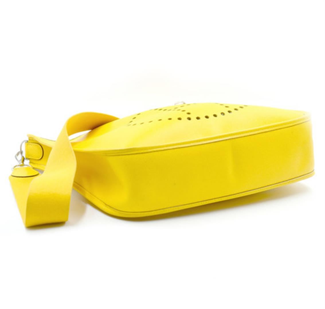 100% Authentic Hermes Evelyne GM in Yellow Epson Leather. The Hermes Evelyne Bag is a practical and chic crossbody shoulder bag that features the iconic Hermes 'H' Logo on the front. There are 3 generations of the Evelyne, the Evelyne I (first gen) has no external pocket. The Evelyne was named after Évelyne Bertrand, who was the head of Hermès's riding department. It was designed in 1978 to carry grooming equipment and was sold in stores alongside other equestrian goods. The perforated H was designed to enable air to enter the bag to dry the equipment. Today, the Hermes Evelyne bag is used to tote around fashionista's necessities with the utmost of style and ease! Product is gently used, but has been well maintained. There may be small markings, scratches or light signs of use, please see pictures.