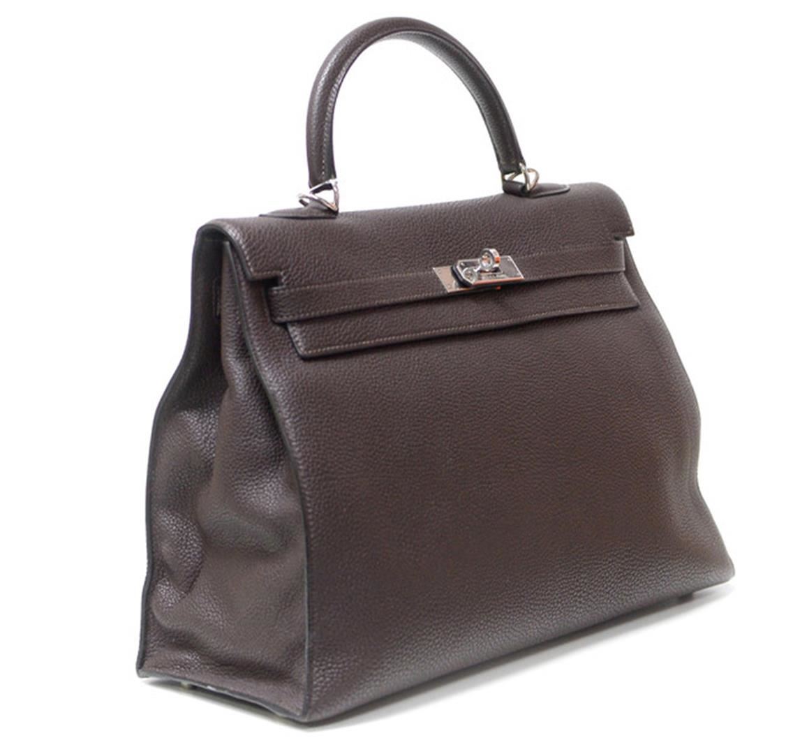 The Hermes Kelly Bag is one of the most sought after bags in the world. And this 35cm chocolate brown Hermes Kelly bag with palladium hardware is not exception! This Kelly features tonal stitching, front toggle closure, a clochette with lock and key and a single rolled handle can be carried in hand or at the elbow. The interior features one zip pocket with an Hermes engraved pull and two open pockets on opposite side. In excellent condition and a great neautral but stunning color- you cant go wrong with this on. this 35cm Kelly bag is sure to turn heads. Long strap is not included.