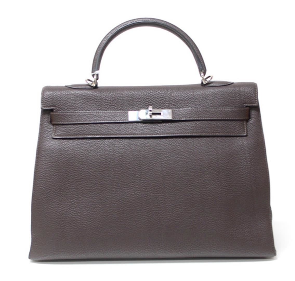 The Hermes Kelly Bag is one of the most sought after bags in the world. And this 35cm chocolate brown Hermes Kelly bag with palladium hardware is not exception! This Kelly features tonal stitching, front toggle closure, a clochette with lock and key and a single rolled handle can be carried in hand or at the elbow. The interior features one zip pocket with an Hermes engraved pull and two open pockets on opposite side. In excellent condition and a great neautral but stunning color- you cant go wrong with this on. this 35cm Kelly bag is sure to turn heads. Long strap is not included.