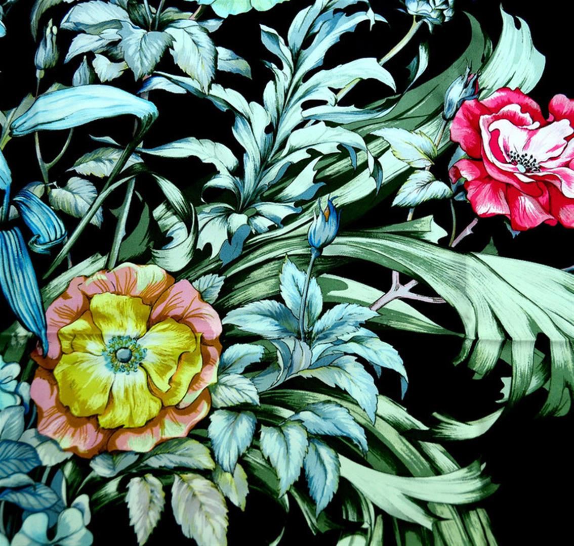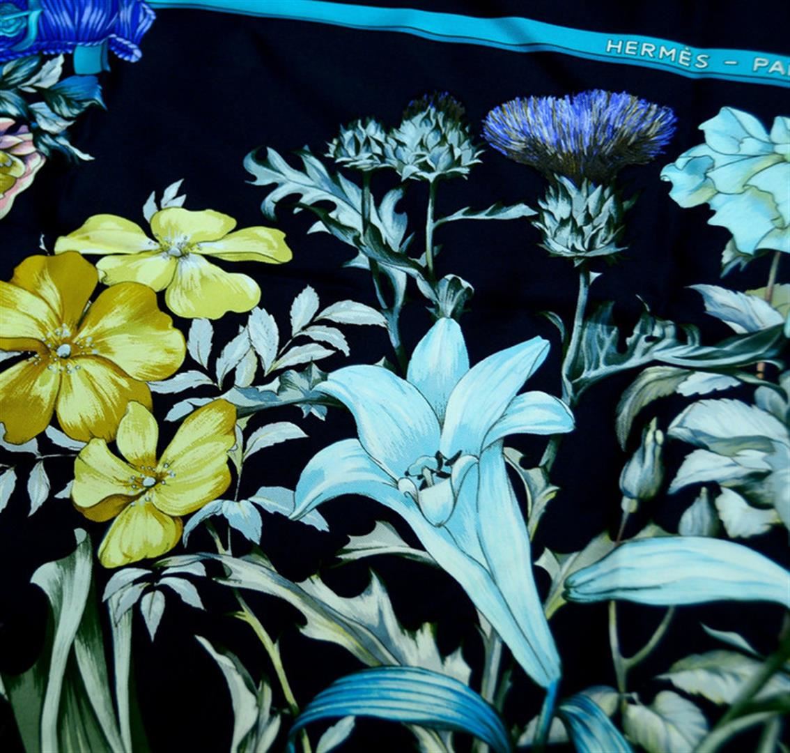 Gorgeous black Hermes scarf with ornate floral design complete with royal blue and turquoise ribbon frame motif. Perfect for a splash of color for any outfit or show it off daily by tying it to the handle of your favorite handbag!