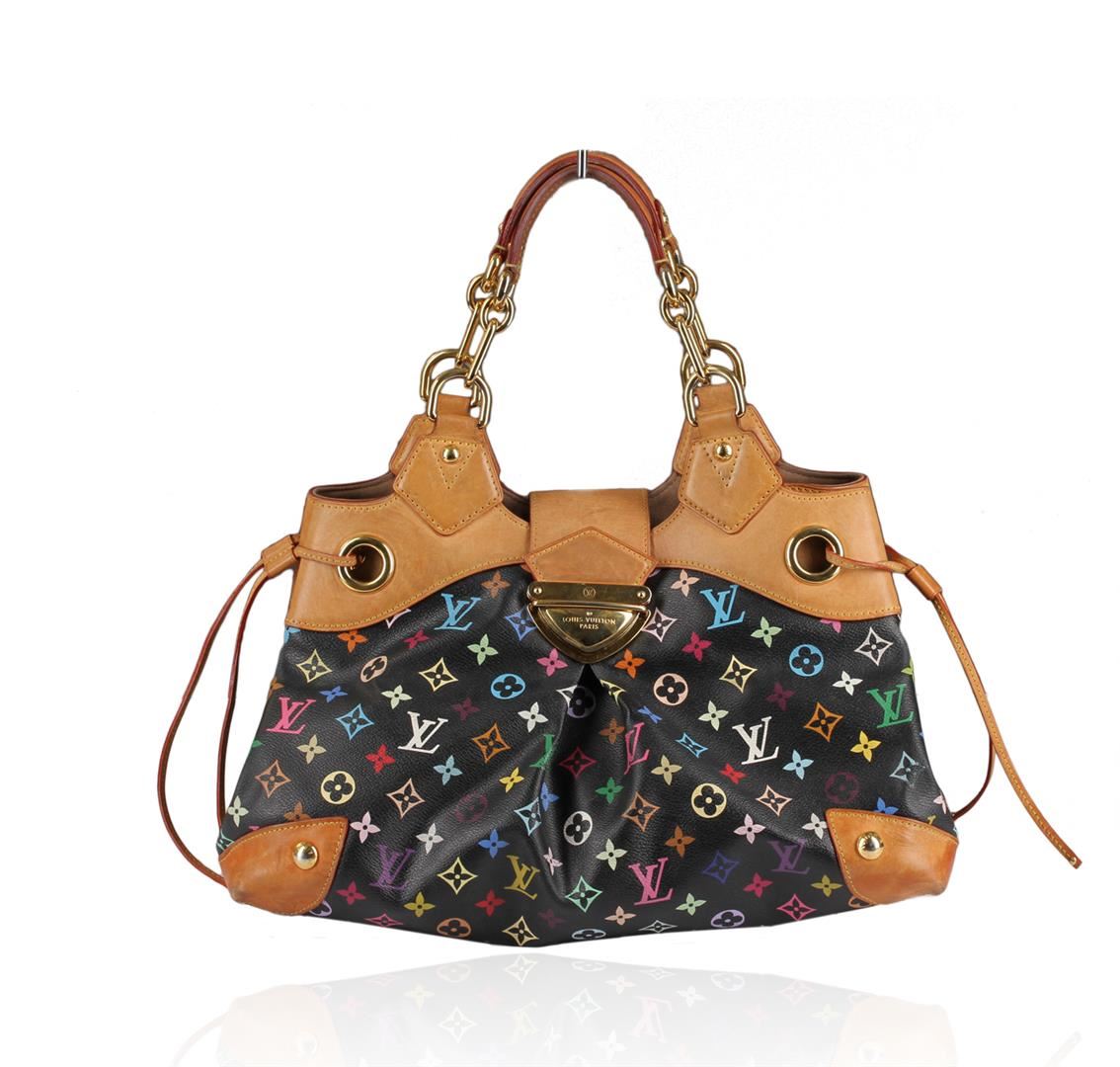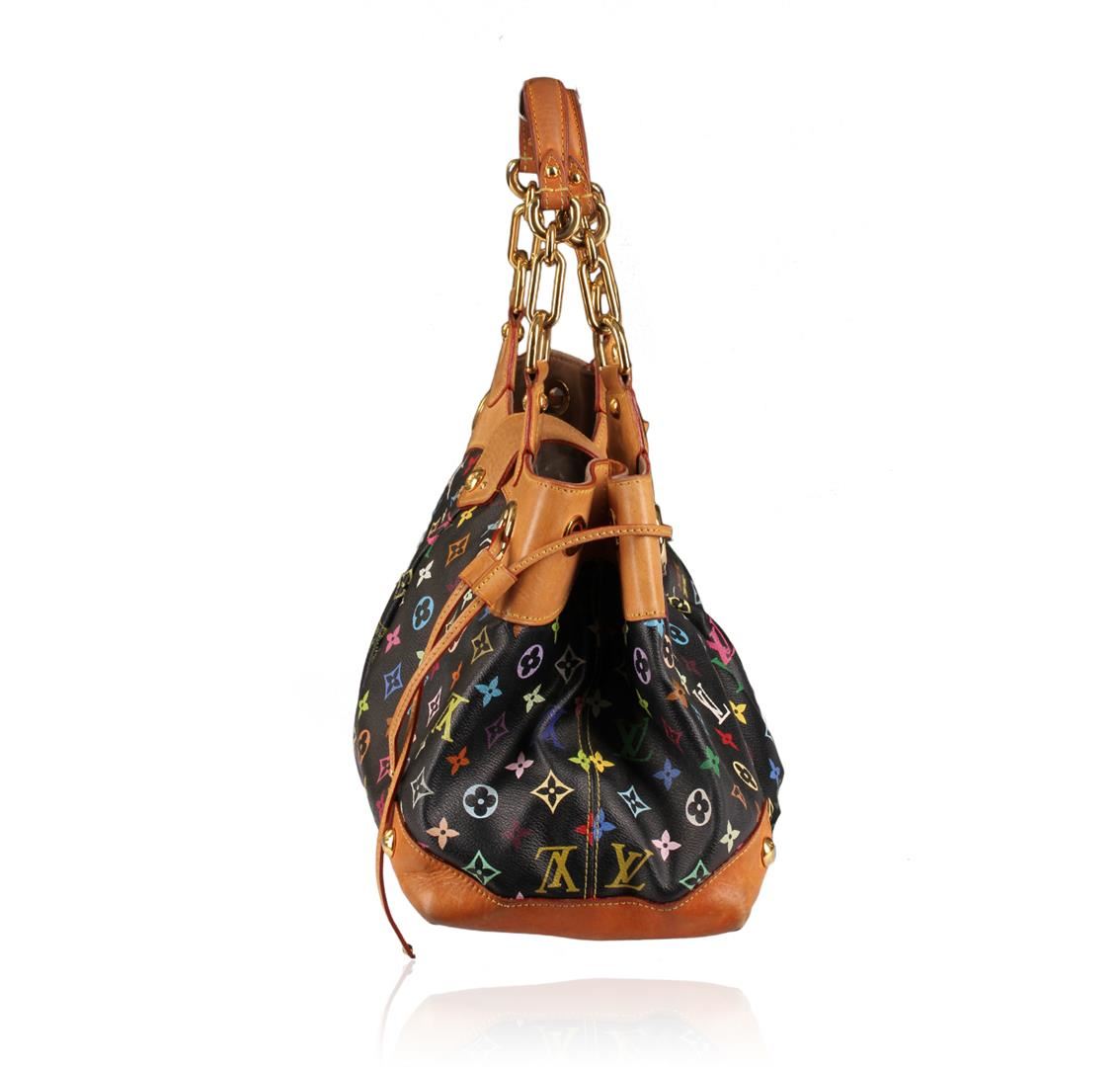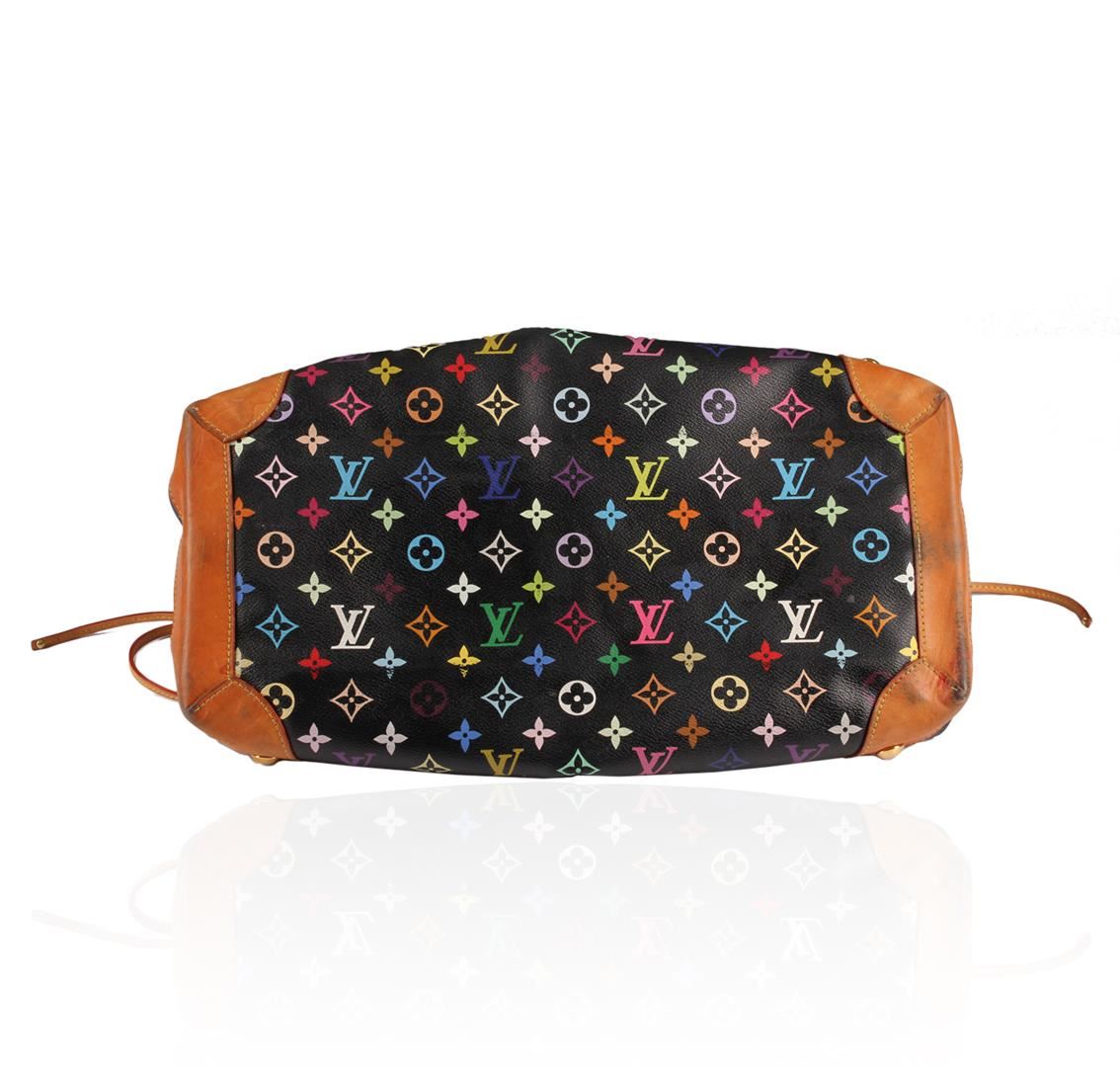 100% Authentic Louis Vuitton Black Multicolored Monogram Ursula Bag. This discontinued tote bag is made from iconic Louis Vuitton canvas monogramed with 33 vivid colors and is trimmed with natural cowhide vachetta leather. This natural leather has already achieved the beautiful patina color and is adorned with shiny bronze hardware. Taupe alcantara lining covers the interior of this large purse which features 2 sectioned off sides and 3 pockets: one large open pocket, a small open pocket and one large snap closure pocket. This bag is in good pre-loved condition with signs of wear. Some of the logos are beginning to fade on the monogramed canvas. Natural cowhide leather has stains, bottom is stained. Interior has a few stains. Please see pictures. Approximate Dimensions: length 16", width 8", height 11", drop 6". Comes with original Louis Vuitton box.