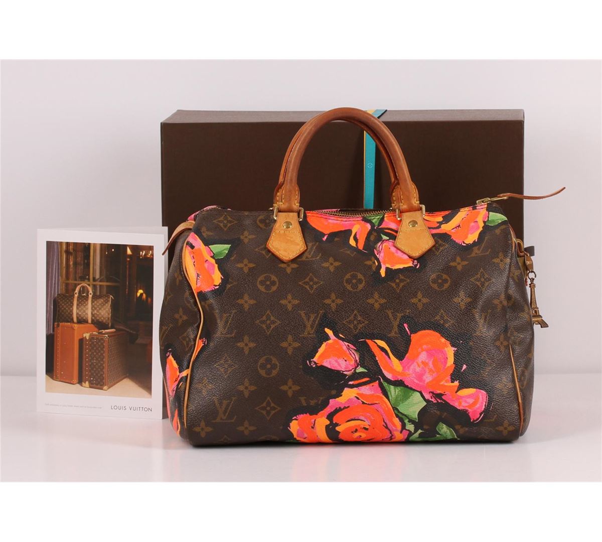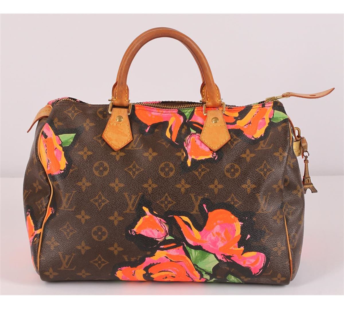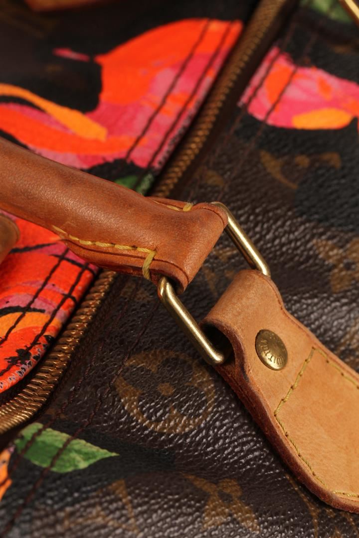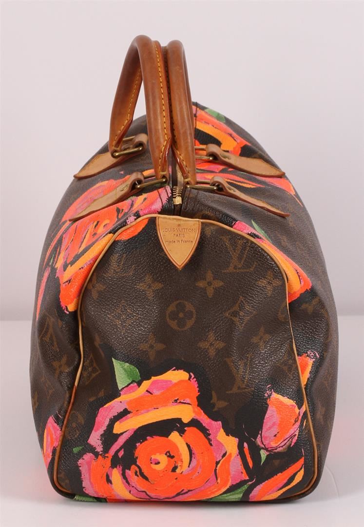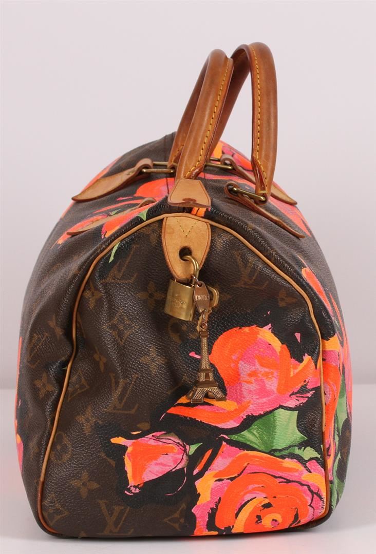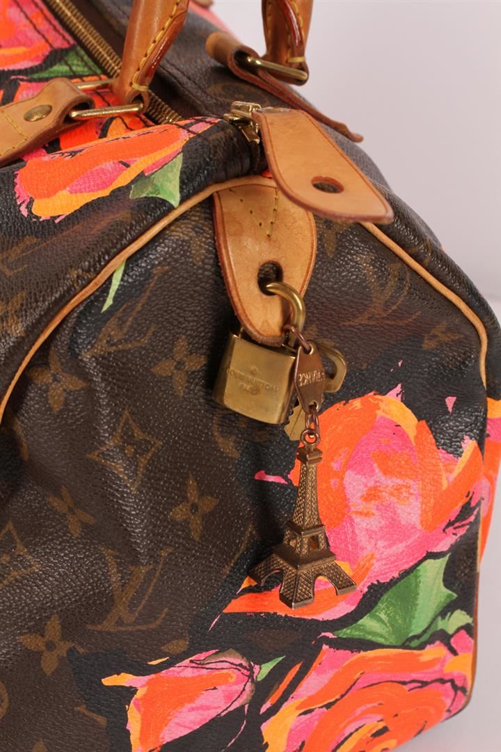 100% Authentic Louis Vuitton Stephen Sprouse Roses Speedy 30 Bag. This limited edition bag is highly sought after and a must have for any handbag lover or bold fashionista. Stephen Sprouse's iconic pop art of neon graffiti flowers accents the classic Louis Vuitton monogramed canvas of this speedy 30. The trim is made from natural cowhide leather and shows signs of patina. This limited edition Louis Vuitton bag is it great used condition with minor stains, patina on leather trim and handles, minor scratches on hardware, no major faults with interior. Zipper still works great! The interior is lined with a brown canvas and features an open pocket. Comes complete with Louis Vuitton lock and keys, a Louis Vuitton box featuring Louis Vuitton ribbon and a Louis Vuitton card.