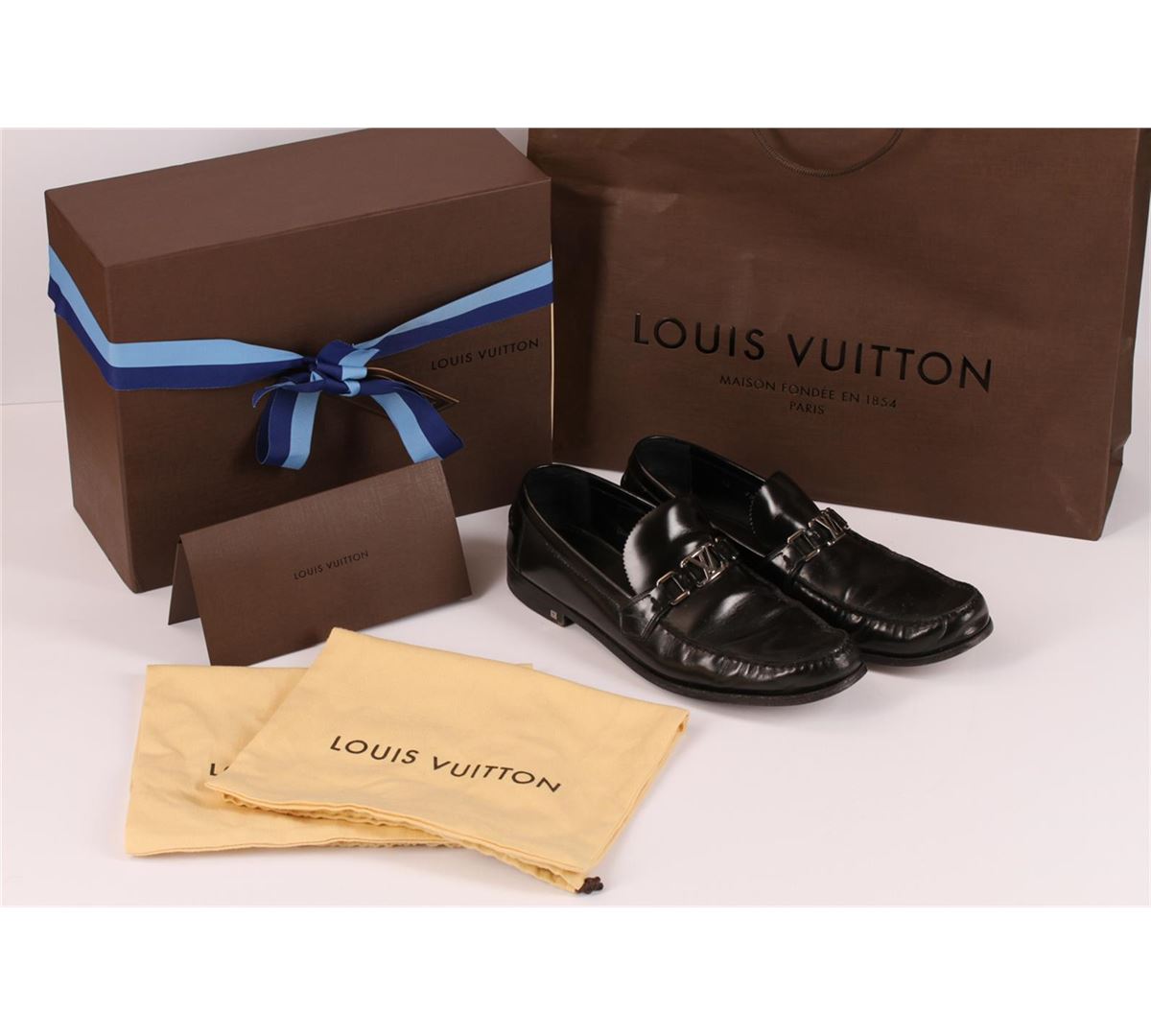100% Authentic Louis Vuitton Mens Black Leather Dress Shoe. These gorgeous black leather loafers are dripping in class. Made from shiny black calf leather they feature a contemporary design with hand-stitched vamp and a padded insole for enhanced comfort. The silver tone LV logo buckle and LV cube embedded in the heel add a bit of classy flair. This wardrobe essential is in good used condition with some signs of wear on the leather and bottom of shoe. Please see pictures. Comes complete with two Louis Vuitton drawstring dust bags, Louis Vuitton card, Louis Vuitton box with ribbon and tag and Louis Vuitton shipping bag. Shoe size is a U.S. Men's US 9.5-10.