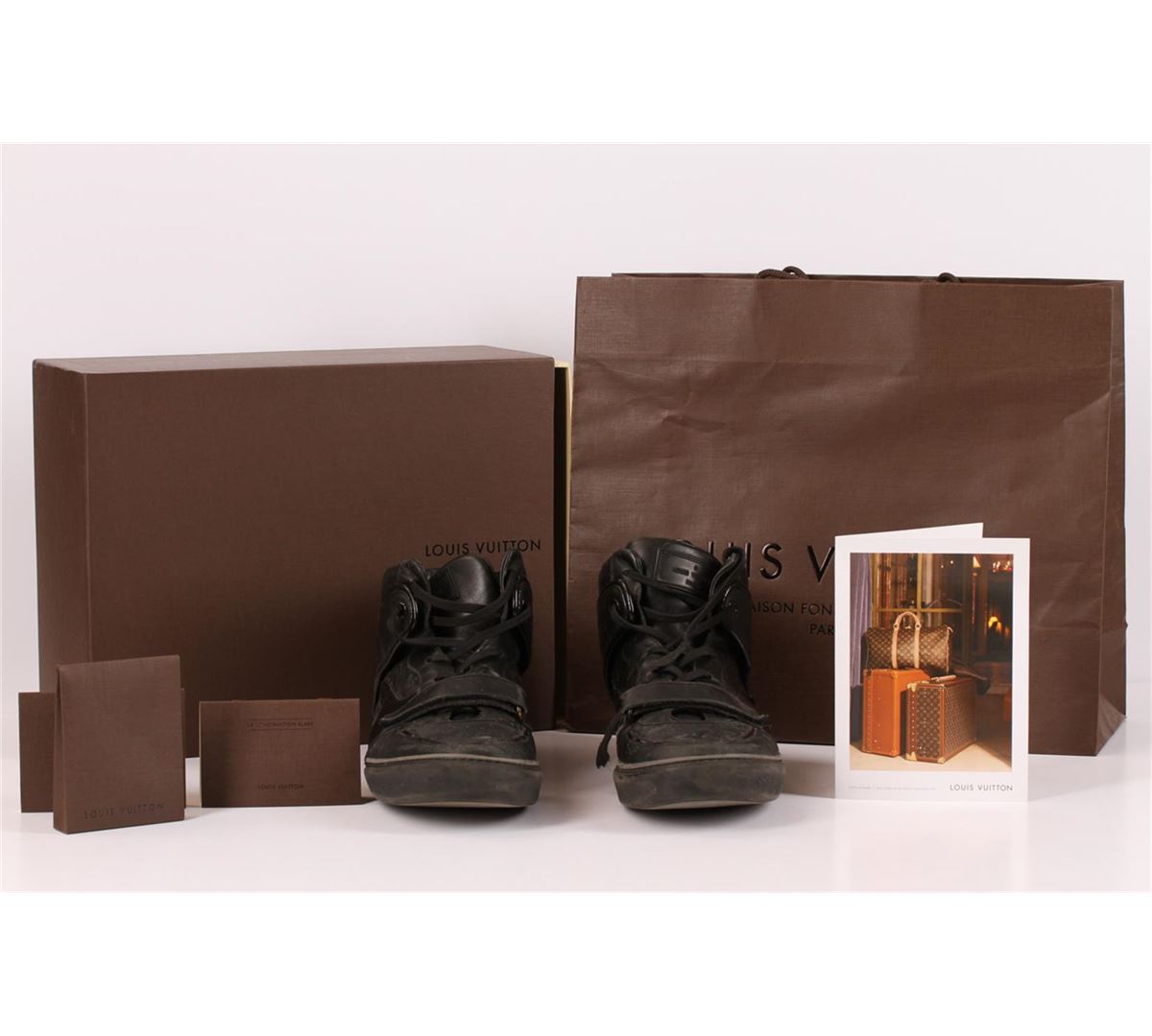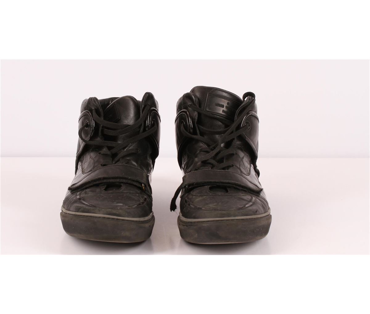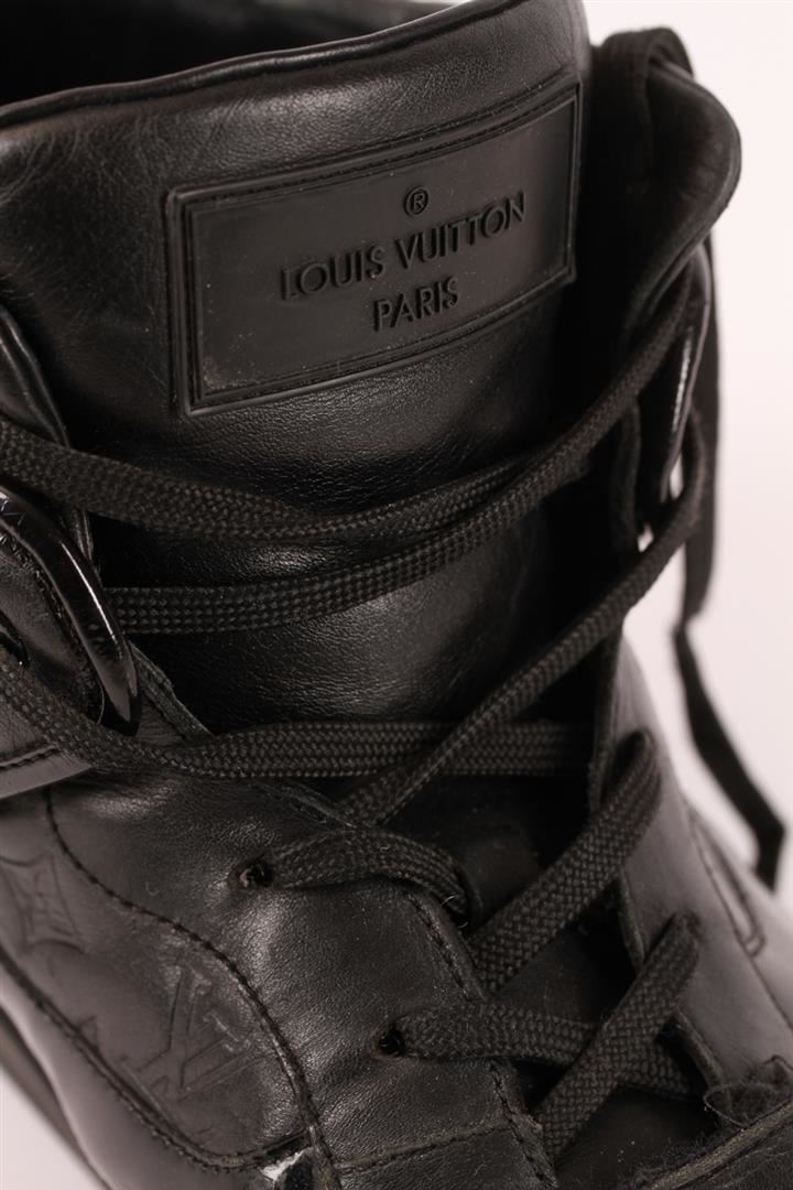 100% Authentic Louis Vuitton Mens Black Monogram Sneakers. This on-trend hi-top sneaker is a mix of smooth and Monogram-embossed calf leather. They are the perfect blend of bold streetwear and luxurious Louis Vuitton details. The tower sneaker also features a thick outsole, padded tongue and rubber sole. These trendy Louis Vuitton men's sneakers are in used condition with signs of wear throughout the shoe. Please see pictures. Shoe size is a Men's Louis Vuitton 12 which fits like a US 13. They come complete with extra shoe laces in a Louis Vuitton packet, Louis Vuitton care booklets, Louis Vuitton box, Louis Vuitton card and Louis Vuitton Shopping Bag.
