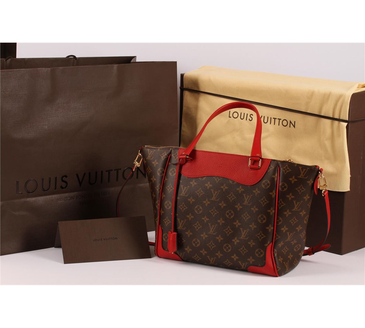 100% Authentic Louis Vuitton Monogram Red Cerise Estrela NM Bag. This new in box bag is an instant classic! The Estrela NM is great way to add a bit of Louis Vuitton luxury to your everyday with its iconic Louis Vuitton brown monogram canvas and timeless shape. Trimmed in vibrant red cowhide leather, this bag stands out in all the right ways! Interior is lined with matching microfiber lining and boasts one large open pocket and two smaller open pockets opposite. Comes complete with removable and adjustable cross-body strap, matching pochette with Louis Vuitton padlock and keys, original dust bag, box with corded ribbon, shopping bag and card. Condition is in great pre-loved condition. Approximate dimensions: length 18.1" x width 6.7" x height 11".