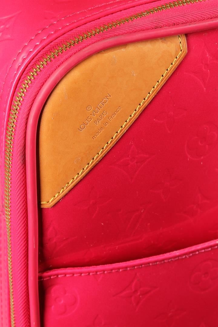 This is a 100% authentic LOUIS VUITTON Vernis Pegase 45 rolling suitcase in Rose Pop. This chic cabin sized suitcase is crafted of ultra-glossy Louis Vuitton monogram vernis patent leather in the most beautiful and bright shade of pink. This highly sought after shade is discontinued and hard to come by, making this piece of luggage highly sought after. The rare bag features natural cowhide trim including a top grip handle, hanging luggage tag and state of the art telescopic handle and roller mechanism. The exterior has an easy to access flat pocket that houses a smaller zipped pocket for safekeepings. The double golden zippers open to a spacious fabric interior where you will find a large zippered pocket and fold-over Velcro flaps to secure your belonging. This is an excellent suitcase ideal for stylish travel of all sorts. This Louis Vuitton bag is in very good pre-loved condition with some natural wear, scratches and a few stains on the patent leather, the cowhide leather trim has turned to a beautiful patina color with some stains. The rolling mechanism and zippers still work great. Interior has a few very small stains. Approximate Dimensions: Length: 14", Height 19", Depth 8", Handle extends to 41". Comes with original Louis Vuitton drawstring dust bag.