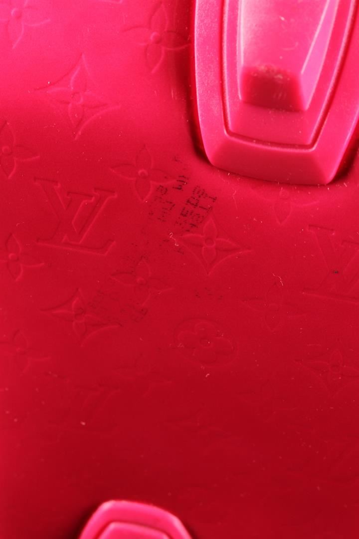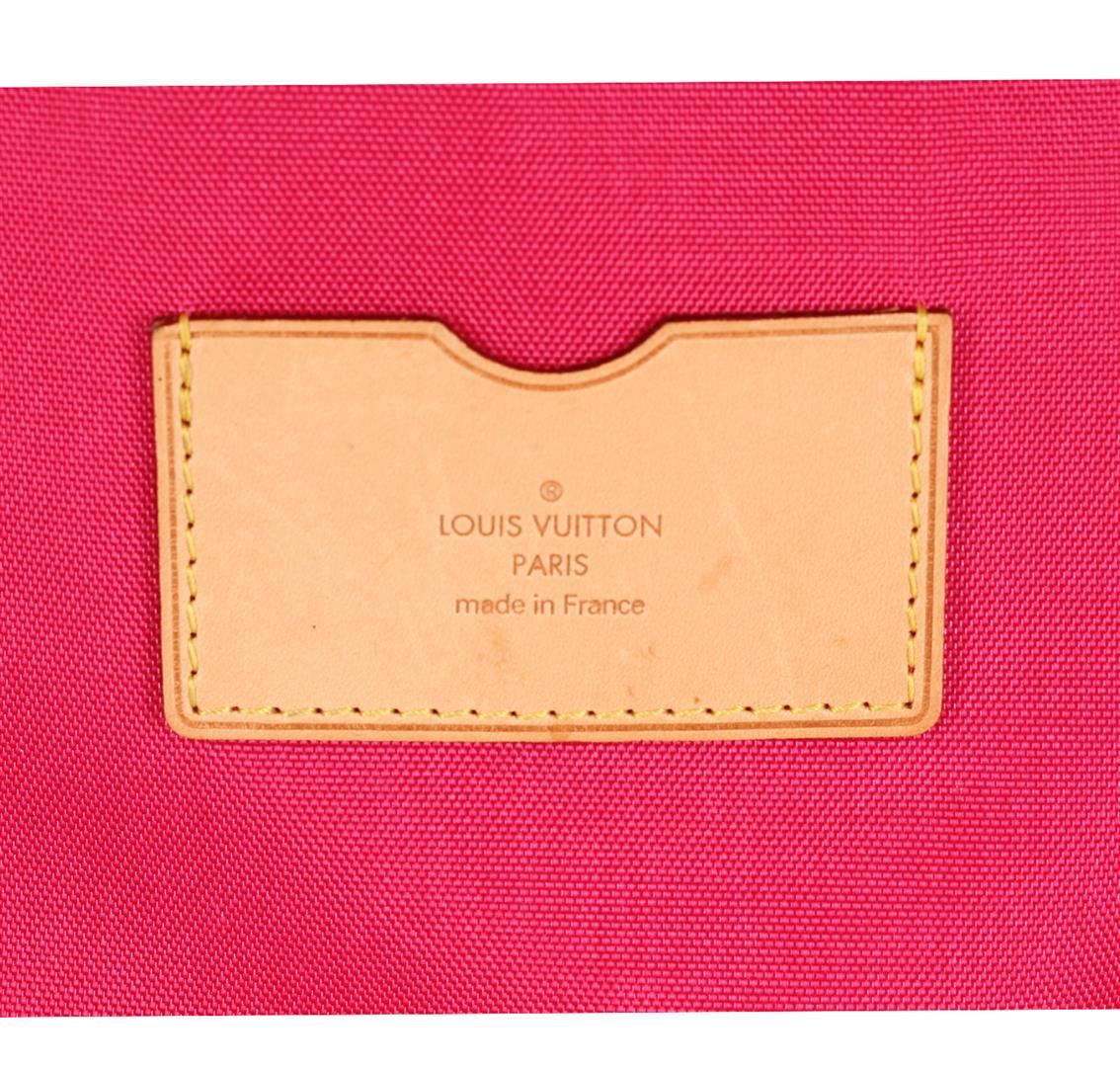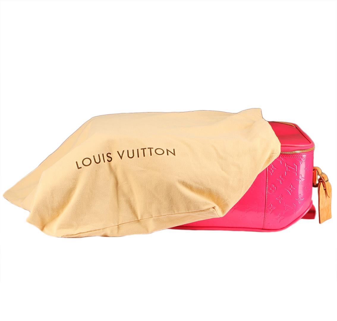 This is a 100% authentic LOUIS VUITTON Vernis Pegase 45 rolling suitcase in Rose Pop. This chic cabin sized suitcase is crafted of ultra-glossy Louis Vuitton monogram vernis patent leather in the most beautiful and bright shade of pink. This highly sought after shade is discontinued and hard to come by, making this piece of luggage highly sought after. The rare bag features natural cowhide trim including a top grip handle, hanging luggage tag and state of the art telescopic handle and roller mechanism. The exterior has an easy to access flat pocket that houses a smaller zipped pocket for safekeepings. The double golden zippers open to a spacious fabric interior where you will find a large zippered pocket and fold-over Velcro flaps to secure your belonging. This is an excellent suitcase ideal for stylish travel of all sorts. This Louis Vuitton bag is in very good pre-loved condition with some natural wear, scratches and a few stains on the patent leather, the cowhide leather trim has turned to a beautiful patina color with some stains. The rolling mechanism and zippers still work great. Interior has a few very small stains. Approximate Dimensions: Length: 14", Height 19", Depth 8", Handle extends to 41". Comes with original Louis Vuitton drawstring dust bag.
