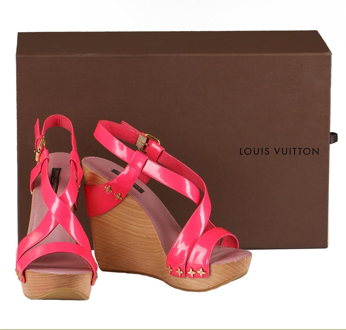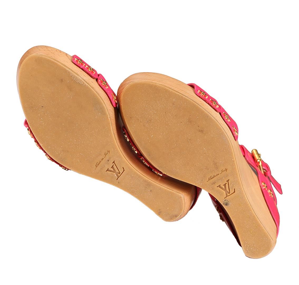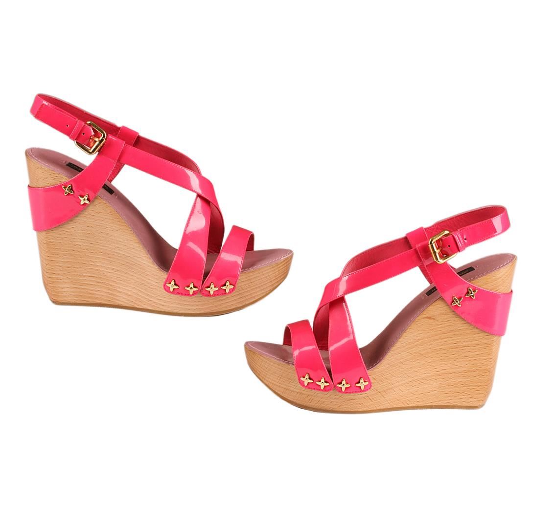 Beautiful bright pink Louis Vuitton Wedges in great pre-loved condition. These rare heels are from the highly sought after Rose Pop collection. Strappy patent leather design, stacked 5" wooden wedges with 1.5" front platform, golden hardware and adjustable ankle strap closures. The smooth wooden wedge design pairs perfectly with the vibrant rose pop vernis leather straps that are secured to the wooden base via golden Louis Vuitton flower studs. The insoles are lined with smooth lavender leather and feature Louis Vuitton Paris labels. Size is a Europe 38 which is equivalent to a US size 7.5-8. These Louis Vuitton wedges are in very good pre-owned condition with normal wear on foot bed, rubber soles and minor knicks/scratches on wood. Please see pictures. Comes with original Louis Vuitton box and dust bag.