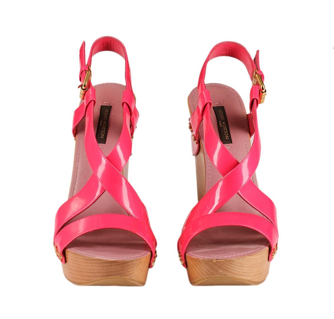 Beautiful bright pink Louis Vuitton Wedges in great pre-loved condition. These rare heels are from the highly sought after Rose Pop collection. Strappy patent leather design, stacked 5" wooden wedges with 1.5" front platform, golden hardware and adjustable ankle strap closures. The smooth wooden wedge design pairs perfectly with the vibrant rose pop vernis leather straps that are secured to the wooden base via golden Louis Vuitton flower studs. The insoles are lined with smooth lavender leather and feature Louis Vuitton Paris labels. Size is a Europe 38 which is equivalent to a US size 7.5-8. These Louis Vuitton wedges are in very good pre-owned condition with normal wear on foot bed, rubber soles and minor knicks/scratches on wood. Please see pictures. Comes with original Louis Vuitton box and dust bag.