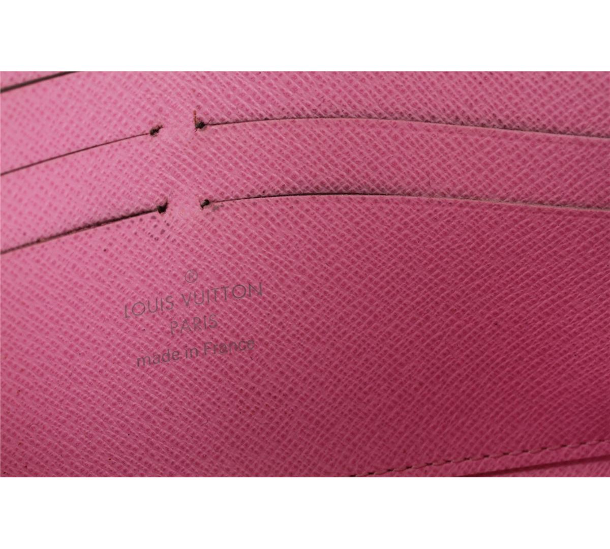 100% Authentic Louis Vuitton White Multicolor Monogram Bow Sarah Wallet. This adorable and discontinued Louis Vuitton wallet is crafted of mini multicolored monogram in 33 bright colors on white canvas and is adorned by a golden brass twist lock and natural cowhide leather bow. This Takashi Murakami creation not only has great design but great functionality as well. The interior is a gorgeous cotton candy pink cross grain leather which houses three open compartments, ten credit card slots and a zipped coin compartment. This wallet is in good pre-loved condition and does show some minor signs of wear on leather, hardware and the natural cowhide leather has reached a beautiful honey colored patina. Approximate Dimensions: Length 8" x width 1" x height 5".