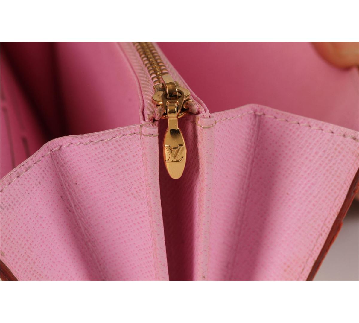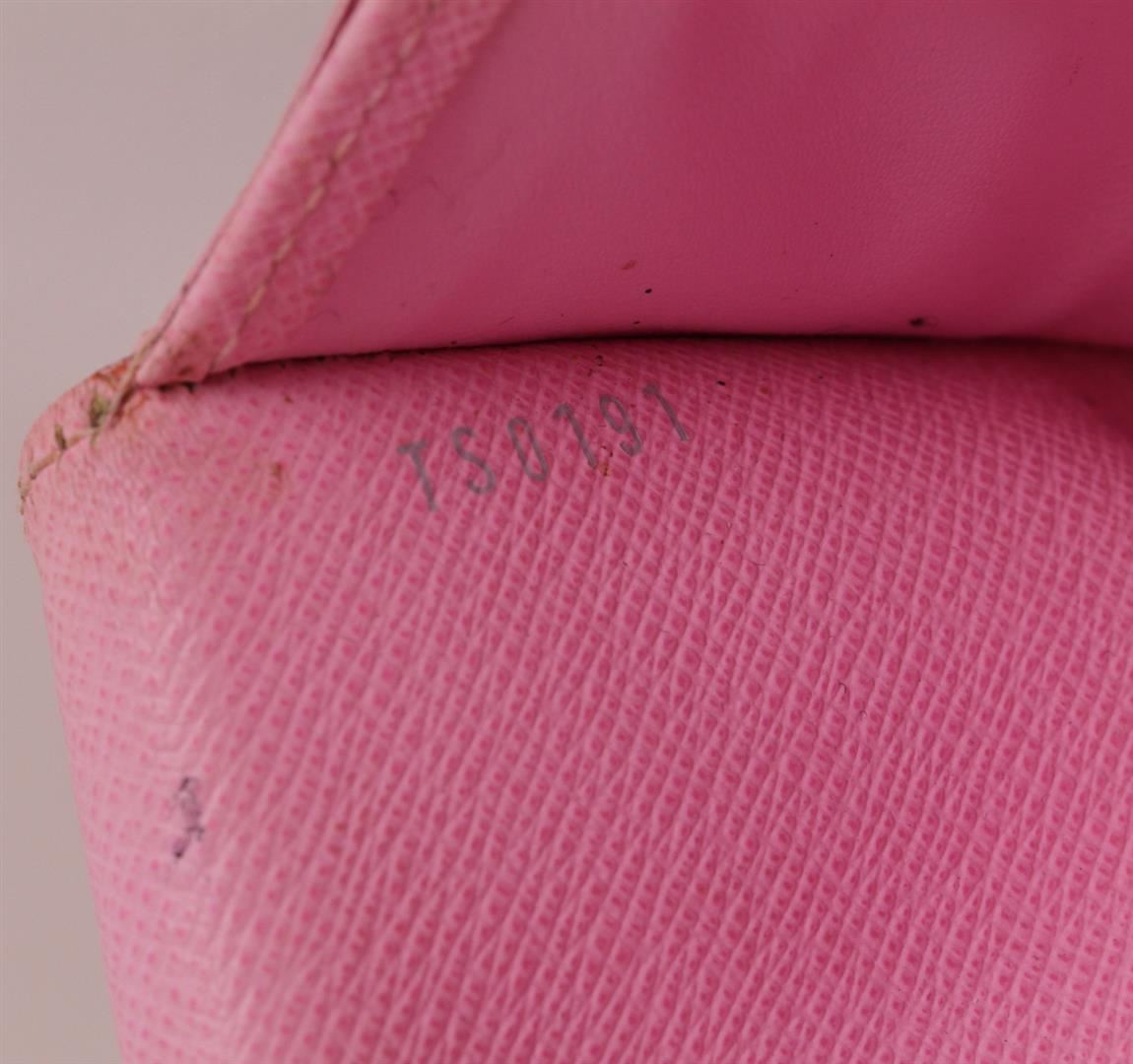 100% Authentic Louis Vuitton White Multicolor Monogram Bow Sarah Wallet. This adorable and discontinued Louis Vuitton wallet is crafted of mini multicolored monogram in 33 bright colors on white canvas and is adorned by a golden brass twist lock and natural cowhide leather bow. This Takashi Murakami creation not only has great design but great functionality as well. The interior is a gorgeous cotton candy pink cross grain leather which houses three open compartments, ten credit card slots and a zipped coin compartment. This wallet is in good pre-loved condition and does show some minor signs of wear on leather, hardware and the natural cowhide leather has reached a beautiful honey colored patina. Approximate Dimensions: Length 8" x width 1" x height 5".