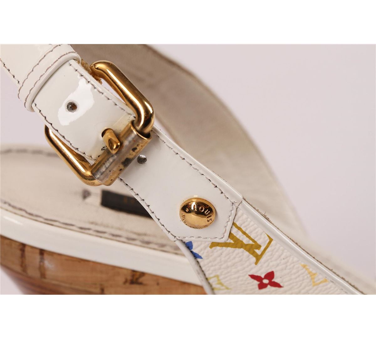 100% authentic Louis Vuitton Santa Monica Sandal in white multicolored monogram canvas. This fashionable cork platform high heel shoe looks fresh and summery in Louis Vuitton's vibrant Monogram Multicolored canvas. These colorful heels have a padded white leather insole and adjustable bronze ankle strap for enhanced comfort. The 3.2 inch heel is the perfect balance of height and comfort for longer wear. There are some signs of wear but nothing too major. Please see pictures. You will surely love these gorgeous and hard to find Louis Vuitton high heels! They come complete with their Louis Vuitton drawstring sleeper bag, Louis Vuitton shoe care booklet and Louis Vuitton box. European size 38 which is equivalent to a US size 7.5-8.