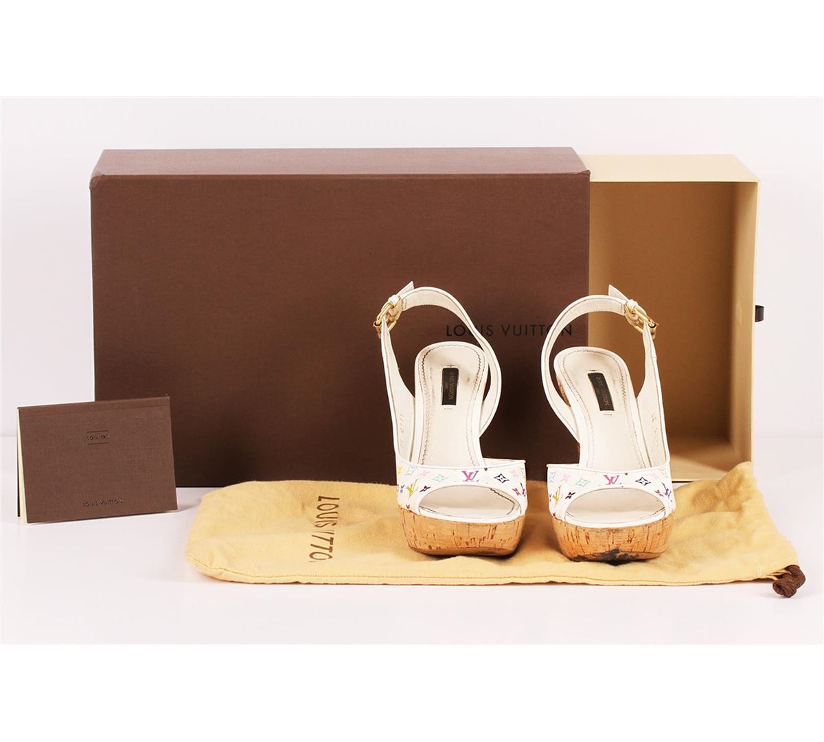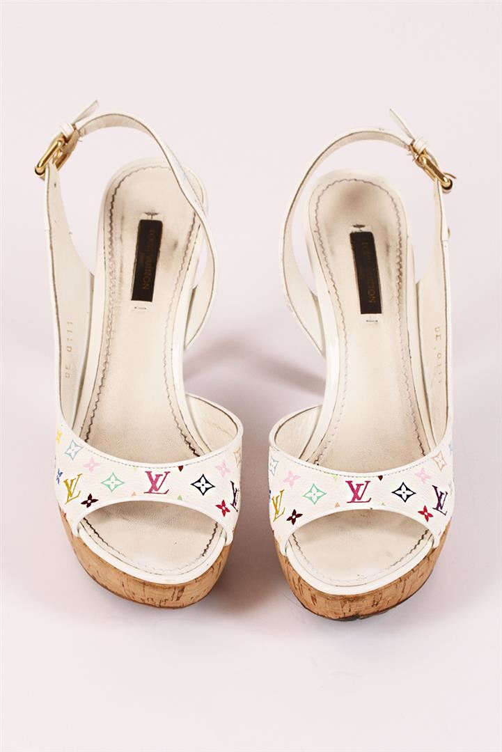 100% authentic Louis Vuitton Santa Monica Sandal in white multicolored monogram canvas. This fashionable cork platform high heel shoe looks fresh and summery in Louis Vuitton's vibrant Monogram Multicolored canvas. These colorful heels have a padded white leather insole and adjustable bronze ankle strap for enhanced comfort. The 3.2 inch heel is the perfect balance of height and comfort for longer wear. There are some signs of wear but nothing too major. Please see pictures. You will surely love these gorgeous and hard to find Louis Vuitton high heels! They come complete with their Louis Vuitton drawstring sleeper bag, Louis Vuitton shoe care booklet and Louis Vuitton box. European size 38 which is equivalent to a US size 7.5-8.