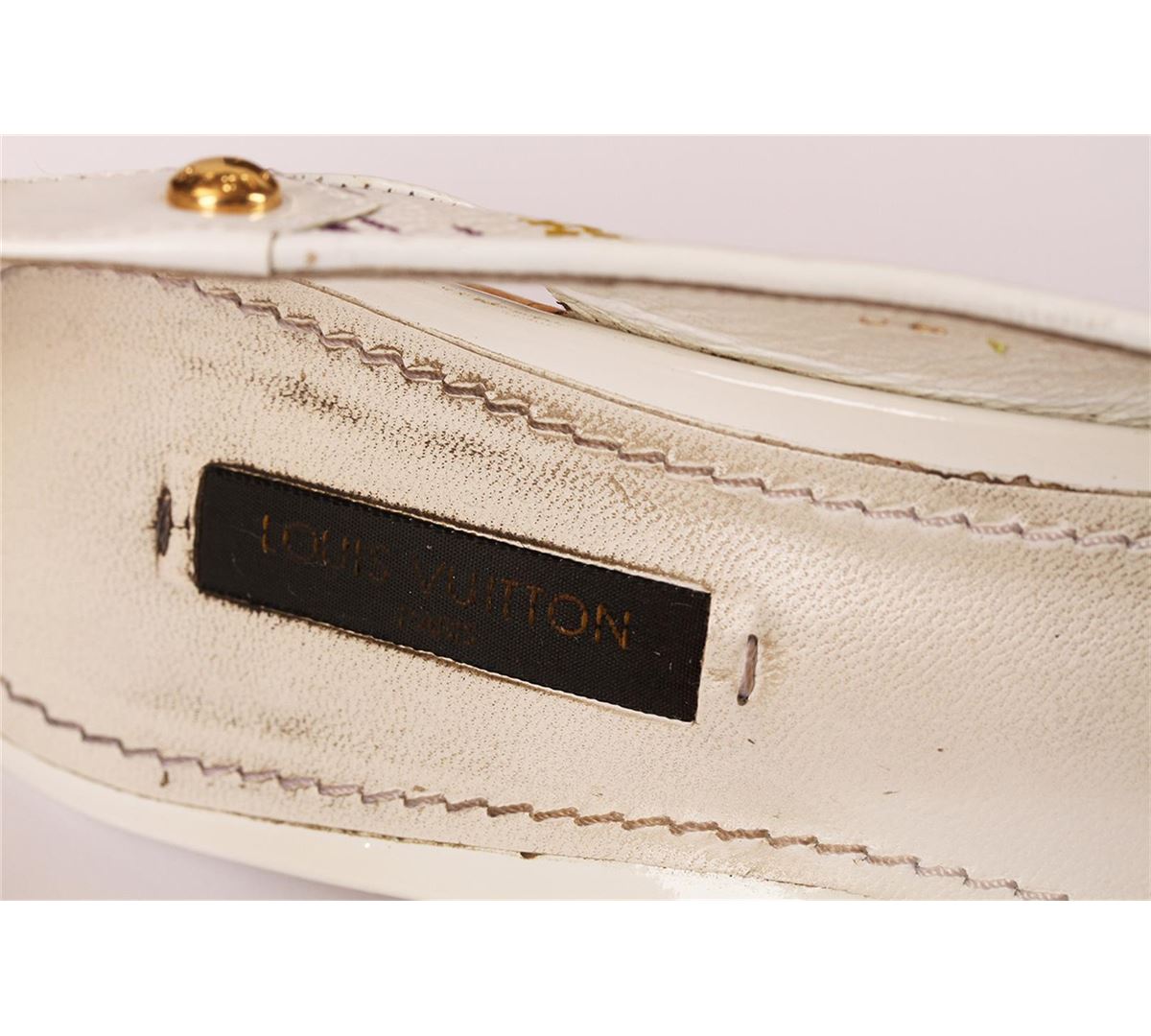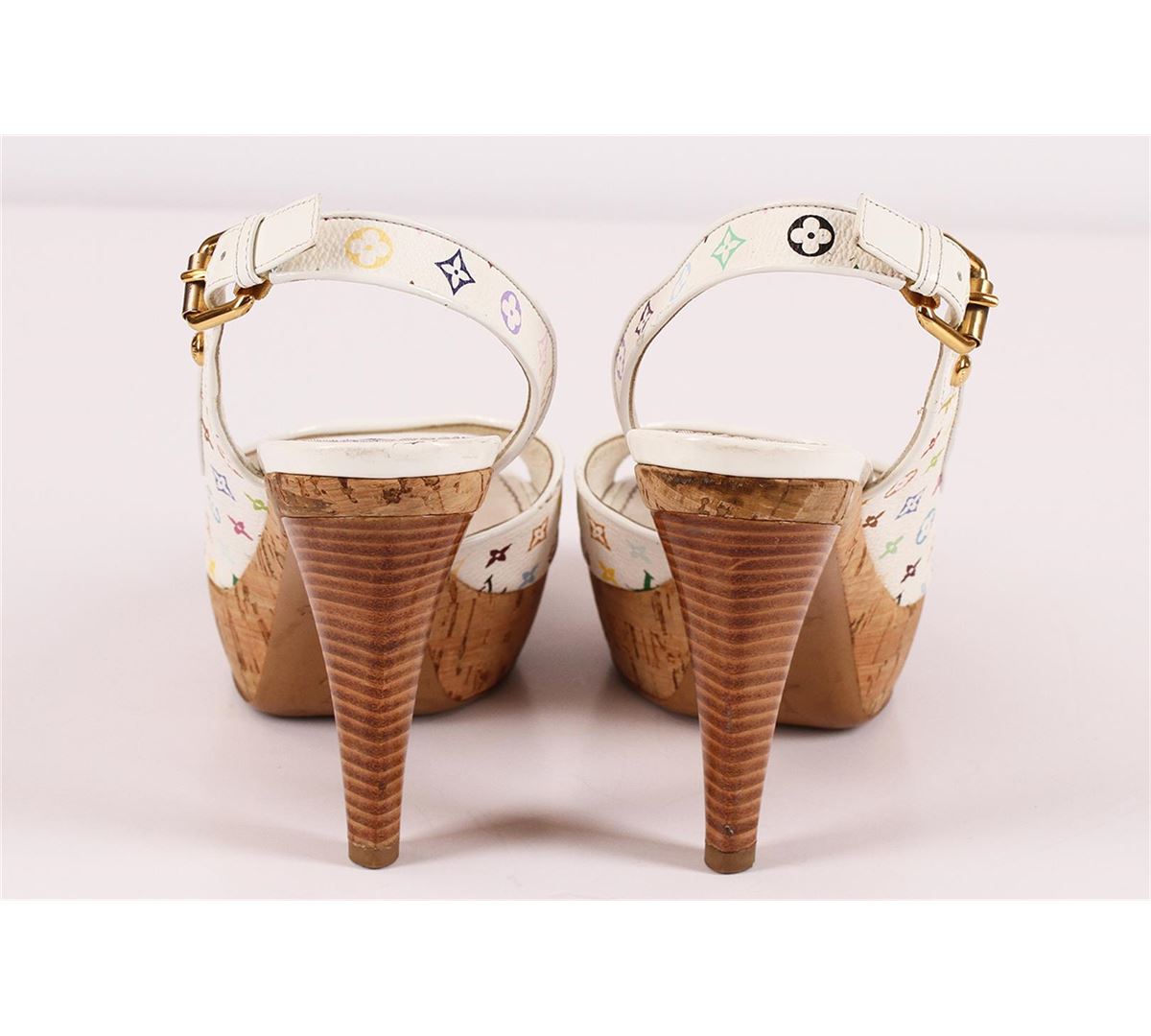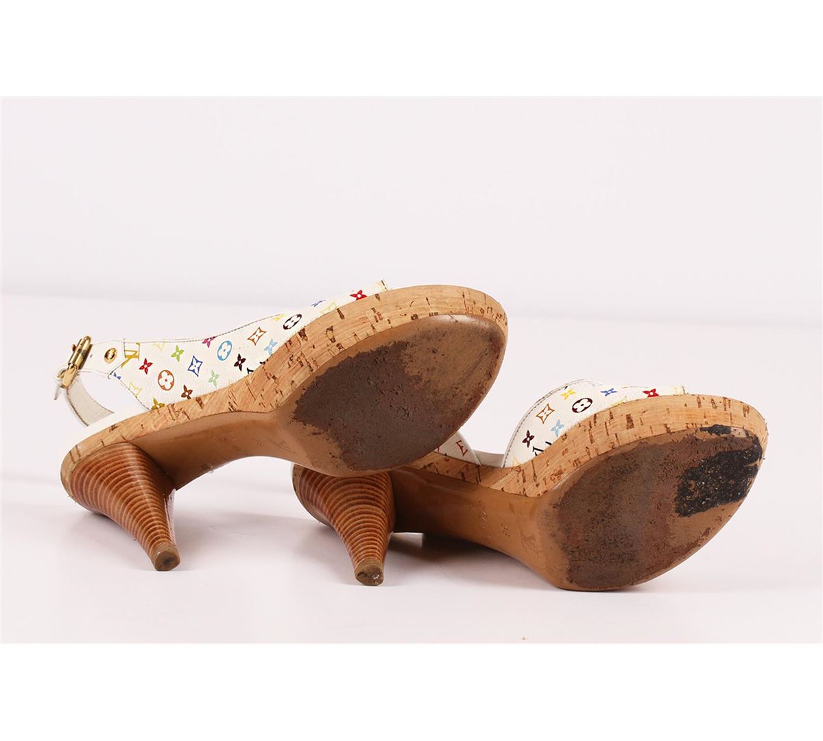 100% authentic Louis Vuitton Santa Monica Sandal in white multicolored monogram canvas. This fashionable cork platform high heel shoe looks fresh and summery in Louis Vuitton's vibrant Monogram Multicolored canvas. These colorful heels have a padded white leather insole and adjustable bronze ankle strap for enhanced comfort. The 3.2 inch heel is the perfect balance of height and comfort for longer wear. There are some signs of wear but nothing too major. Please see pictures. You will surely love these gorgeous and hard to find Louis Vuitton high heels! They come complete with their Louis Vuitton drawstring sleeper bag, Louis Vuitton shoe care booklet and Louis Vuitton box. European size 38 which is equivalent to a US size 7.5-8.