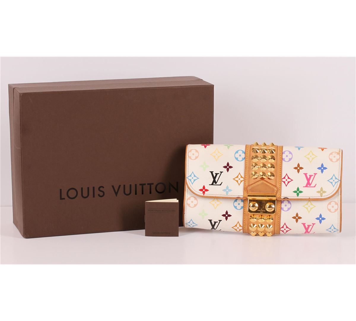 100% Authentic Louis Vuitton White Multicolor Monogram Studded Courtney Clutch. This hip and luxurious purse in made from white canvas with multicolor LV logos in a variety of 33 different colors. Other features include natural cowhide leather trim, gold-tone brass hardware, studded detail and vibrant red Alcantara lining. The Louis Vuitton Courtney clutch opens with a push lock closure to reveal a zip pocket, large open compartment and 6 credit card slots in natural cowhide leather. This bag is in great gently used condition with some signs of wear on hardware and leather. Comes complete with Louis Vuitton box and Louis Vuitton "monogram multicolor" booklet. The Louis Vuitton Cortney clutch combines functionality with sophistication and design. Approximate measurements: length 10.5" x width 2" by height 5".