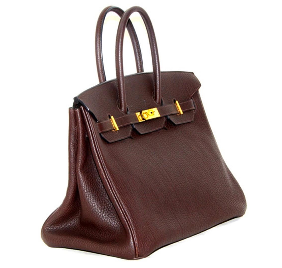 This Authentic Vintage Hermès 35 cm Birkin in Chocolate Clemence leather with Gold Hardware is considered one of the ultimate luxury items the world over. Hand stitched by skilled craftsmen, wait lists of a year or more for a Birkin bag are commonplace. This bag features chocolate brown clemence leather. Clemence leather is made from baby bull hide; it is textured like Togo leather, but the grain is not quite as deep. This gives it an almost matte effect. It is soft to the hand and scratch resistant. Adding to the luxe appeal of this desirable bag is the refined gold hardware. Double rolled handles are carried in hand or at the elbow. Coordinating chevre (goat skin) lining with one side zippered pocket. Blind stamped K within a square.