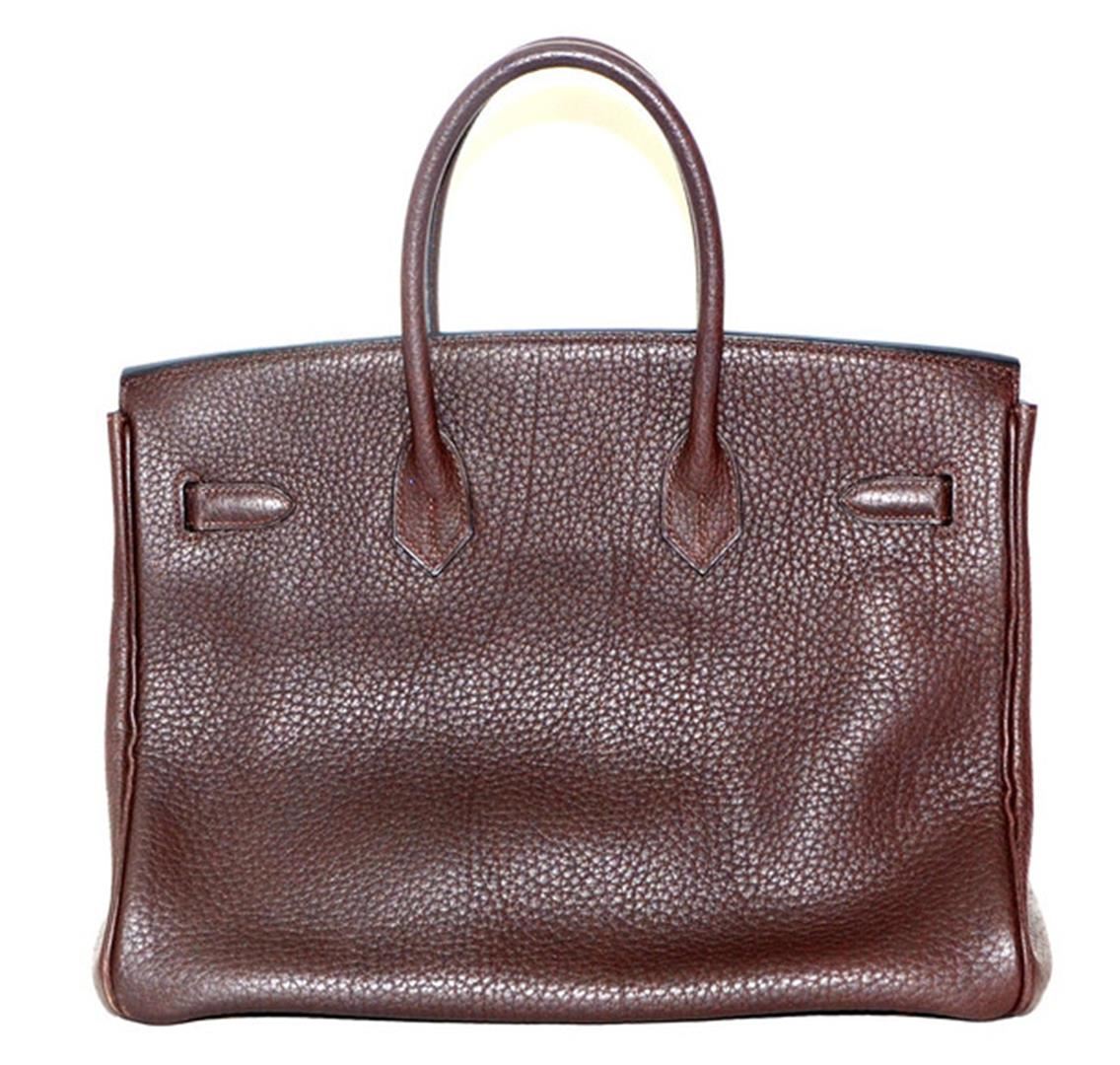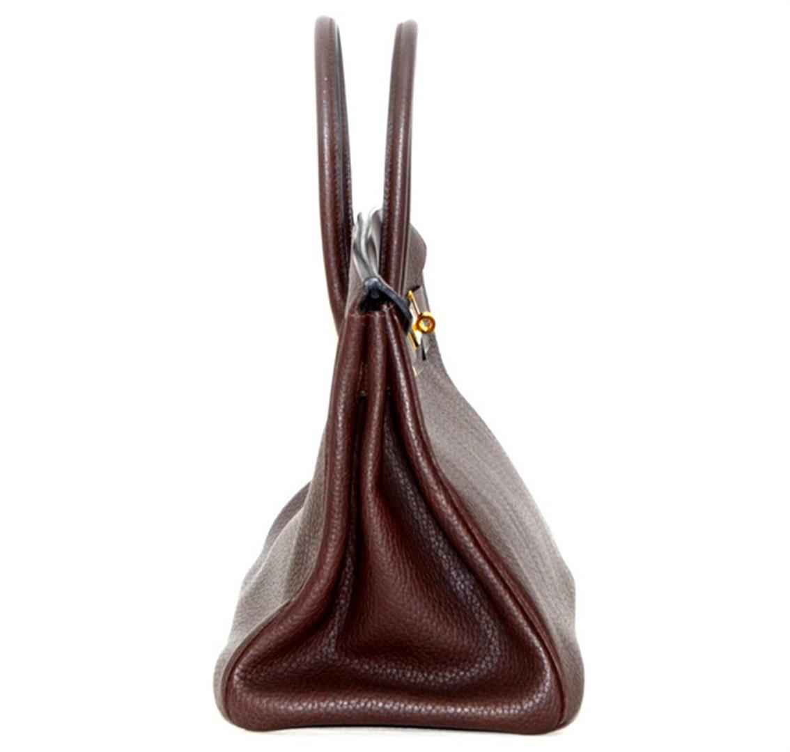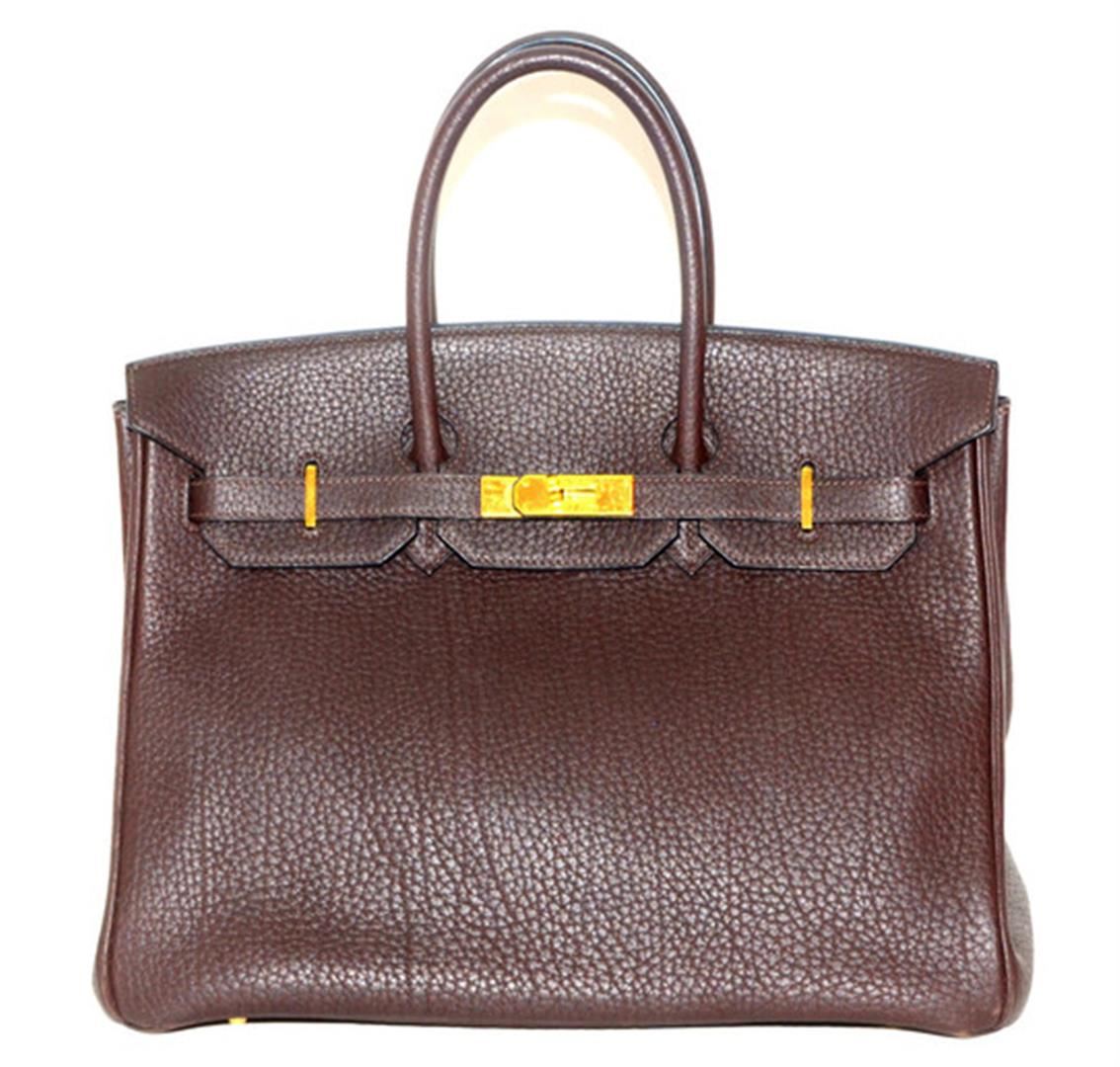 This Authentic Vintage Hermès 35 cm Birkin in Chocolate Clemence leather with Gold Hardware is considered one of the ultimate luxury items the world over. Hand stitched by skilled craftsmen, wait lists of a year or more for a Birkin bag are commonplace. This bag features chocolate brown clemence leather. Clemence leather is made from baby bull hide; it is textured like Togo leather, but the grain is not quite as deep. This gives it an almost matte effect. It is soft to the hand and scratch resistant. Adding to the luxe appeal of this desirable bag is the refined gold hardware. Double rolled handles are carried in hand or at the elbow. Coordinating chevre (goat skin) lining with one side zippered pocket. Blind stamped K within a square.