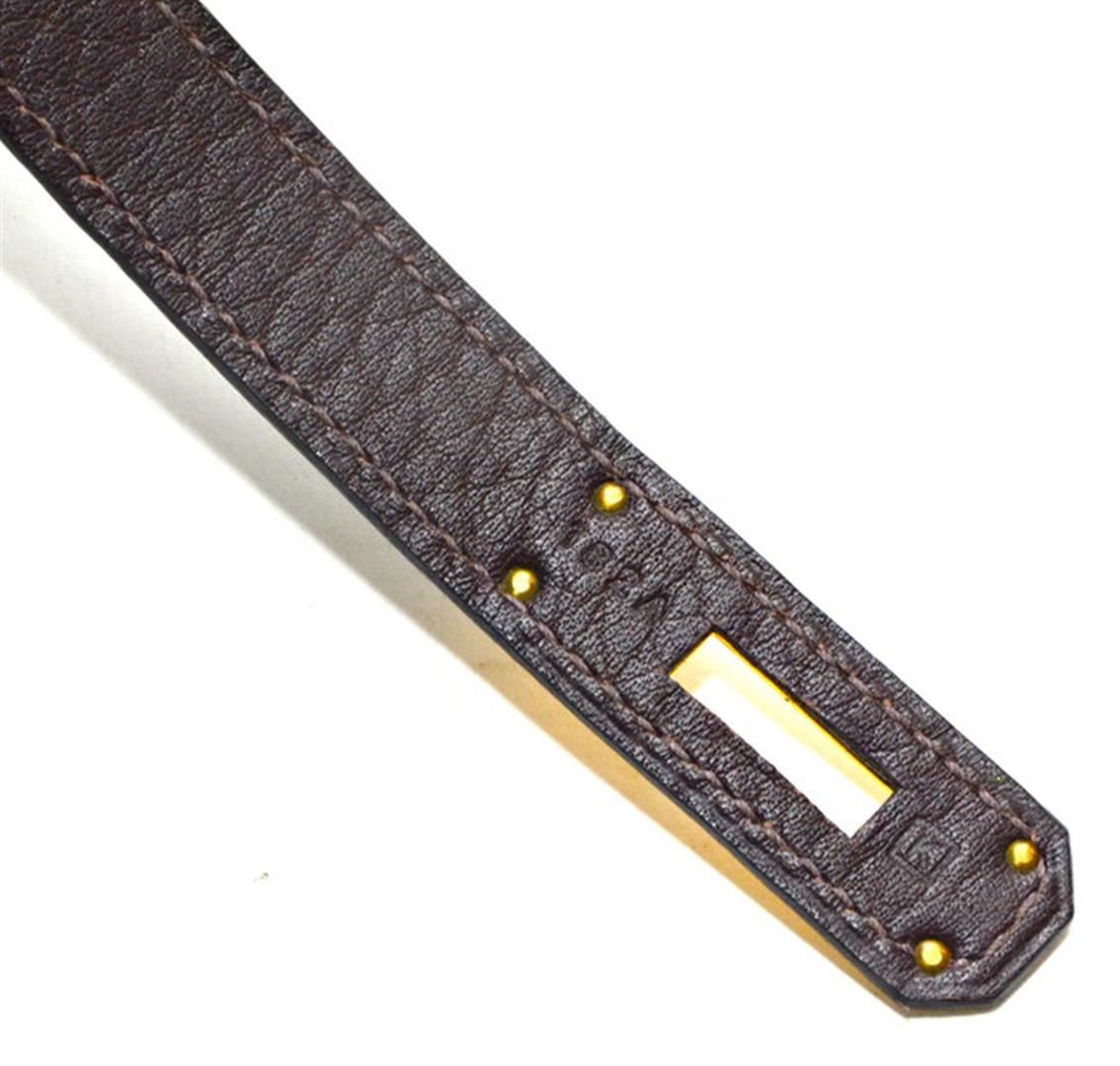 This Authentic Vintage Hermès 35 cm Birkin in Chocolate Clemence leather with Gold Hardware is considered one of the ultimate luxury items the world over. Hand stitched by skilled craftsmen, wait lists of a year or more for a Birkin bag are commonplace. This bag features chocolate brown clemence leather. Clemence leather is made from baby bull hide; it is textured like Togo leather, but the grain is not quite as deep. This gives it an almost matte effect. It is soft to the hand and scratch resistant. Adding to the luxe appeal of this desirable bag is the refined gold hardware. Double rolled handles are carried in hand or at the elbow. Coordinating chevre (goat skin) lining with one side zippered pocket. Blind stamped K within a square.