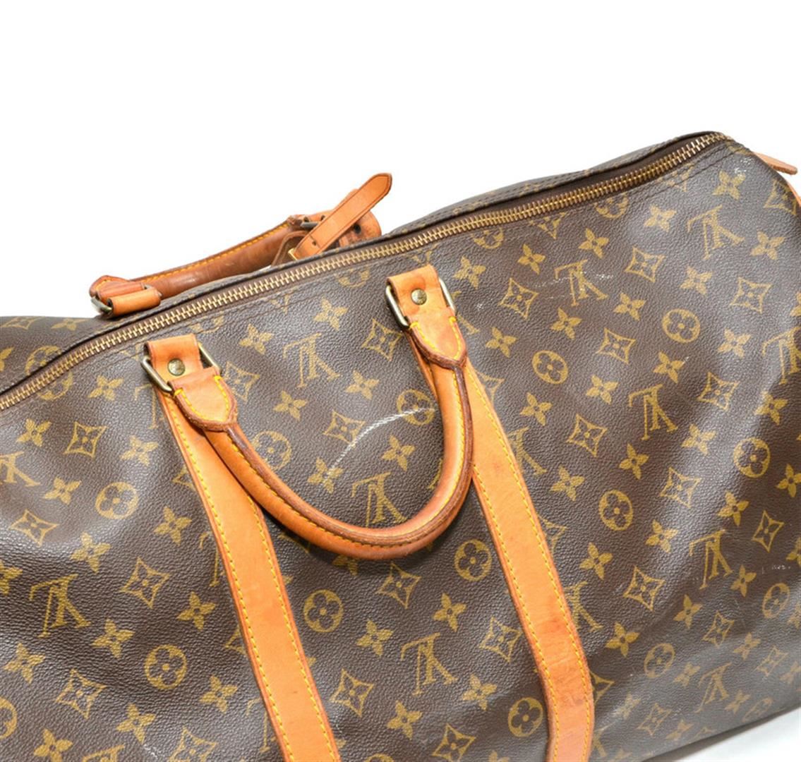 Travel in style with this beautiful Authentic Vintage Louis Vuitton 60cm Keepall Bag. The Brown Monogram canvas is iconic and finished with luxurious goldtone hardware. This is the perfect bag for a weekend getaway or overnight trip. It is in good pre-owned condition and includes the removable leather identification tag. Zipper in good working condition. Please see pictures for minor scuffs and scratches.