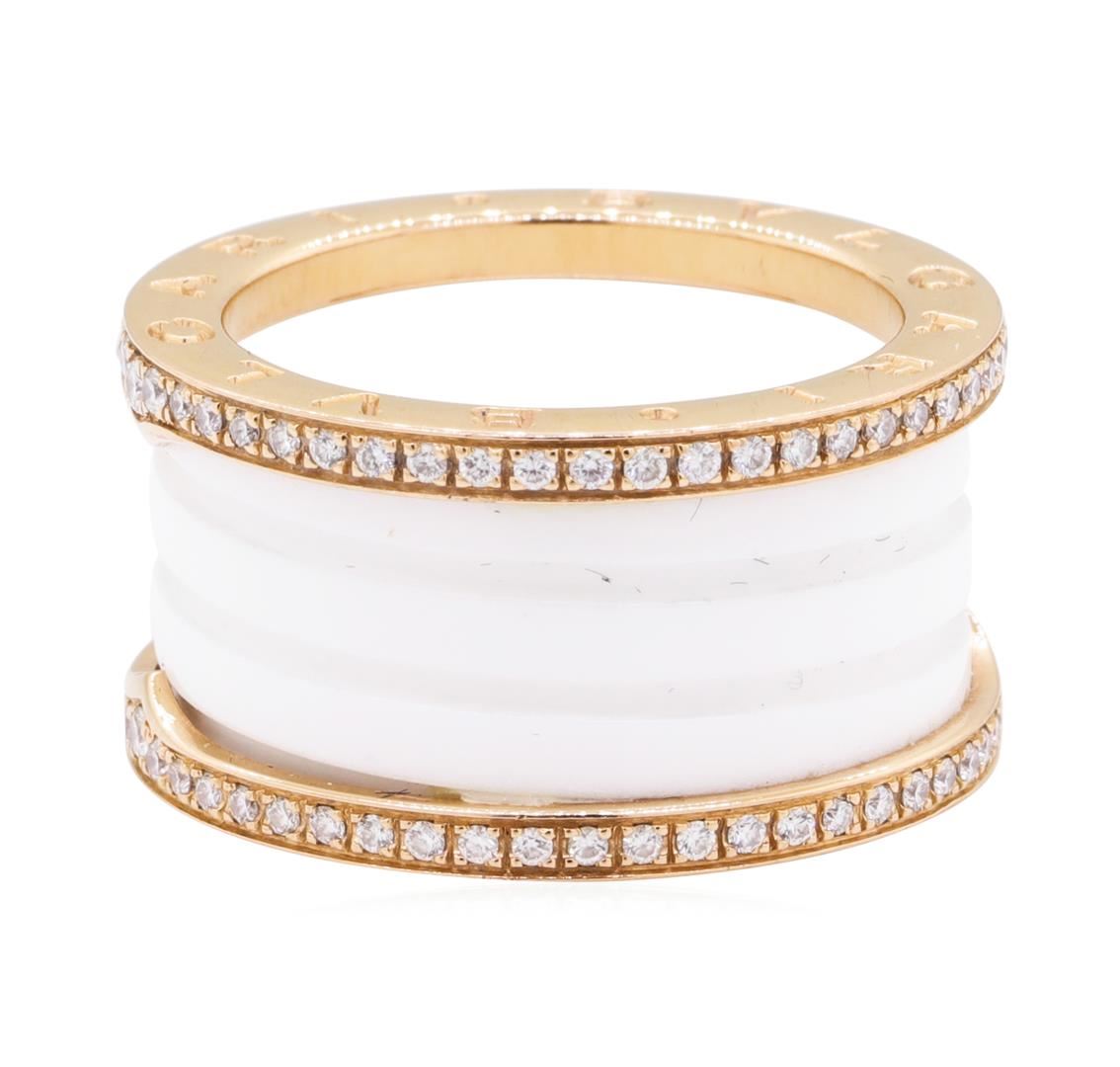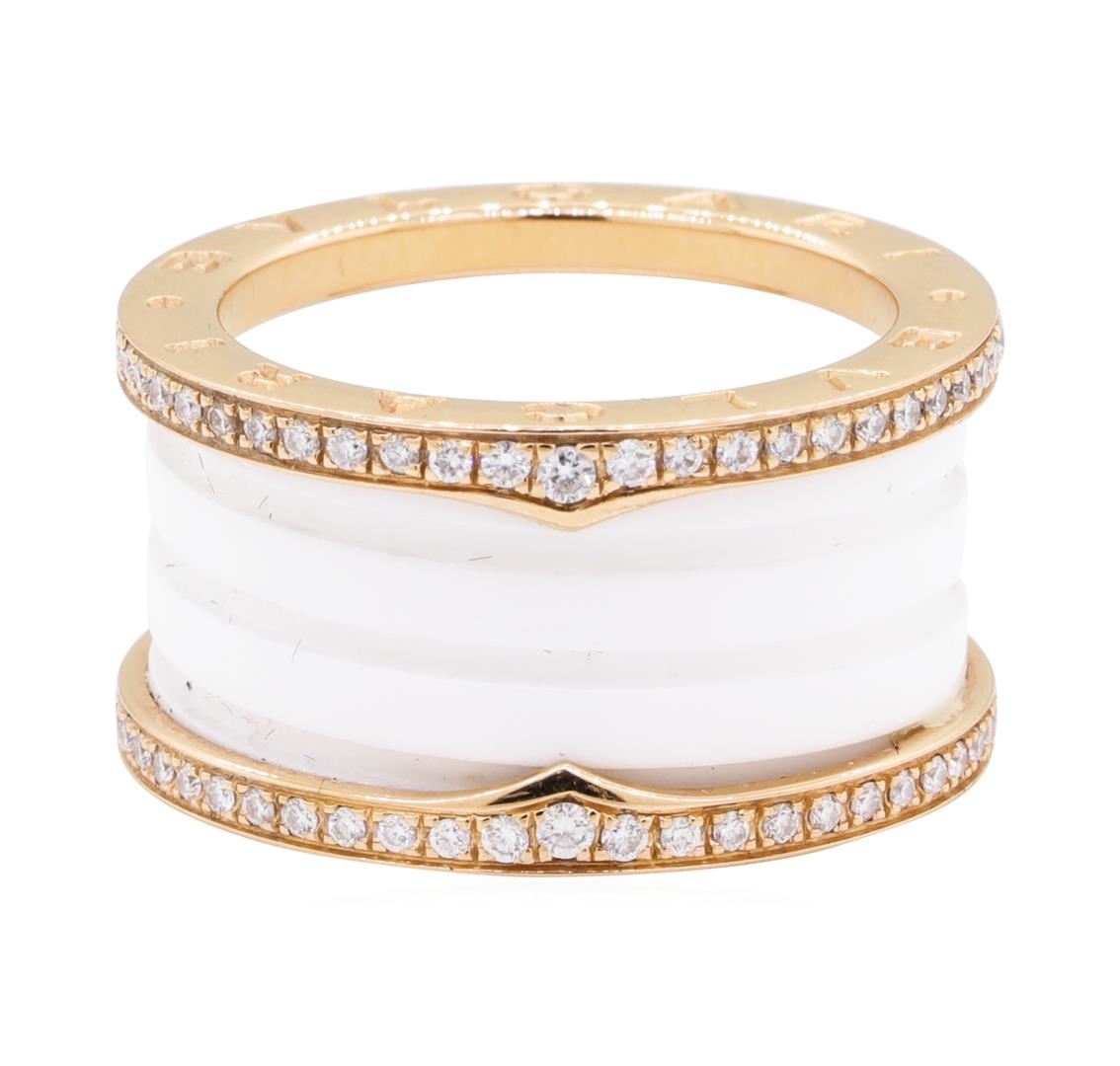 One electronically tested 18KT rose gold lady's combination cast & assembled fashion designer ring with a bright polish finish. The featured lady's ring is from the BVLGARI B.ZERO1 collection and has a white ceramic spiral set between two 18KT rose gold loops. The ring has a shank measuring 12.05 millimeters wide. Trademark is Bulgari. Identified with markings of '750'. Condition is new, good workmanship. Containing: Four prong set round brilliant cut diamonds, measuring 1.40 - 1.35 x 0.86mm (depth est.) approximate total weight of 4 Stones = 0.04ct. Graded in the setting. Color F - G, Clarity VS-1 to VS-2, Cut Very Good Ninety-Six prong set round brilliant cut diamonds, measuring 1.20 - 1.00 x 0.68mm (depth est.) approximate total weight of 96 Stones = 0.46ct. Graded in the setting. Color F - G, Clarity VS-1 to VS-2, Cut Very Good. Total Weight of Diamonds 0.50ct. Total Weight of Ring 9.00gm. GAS Appraised.