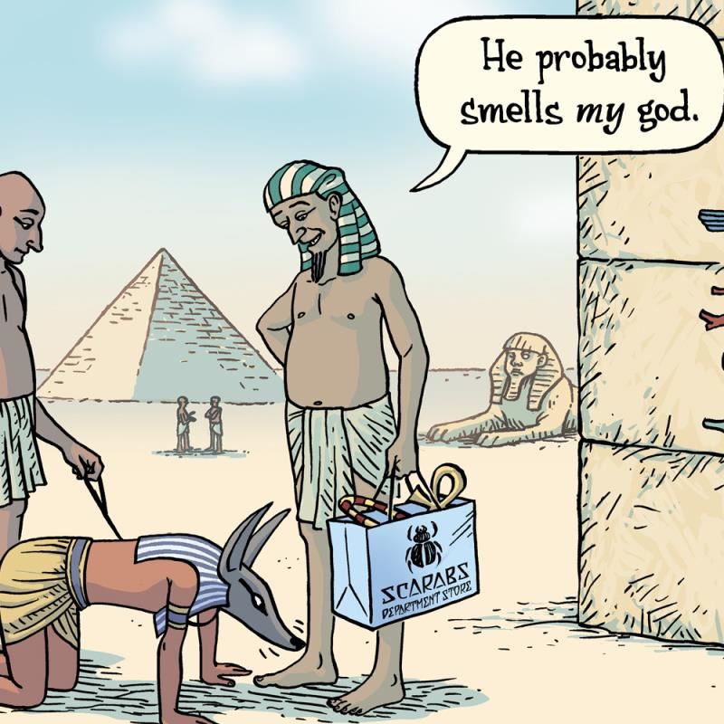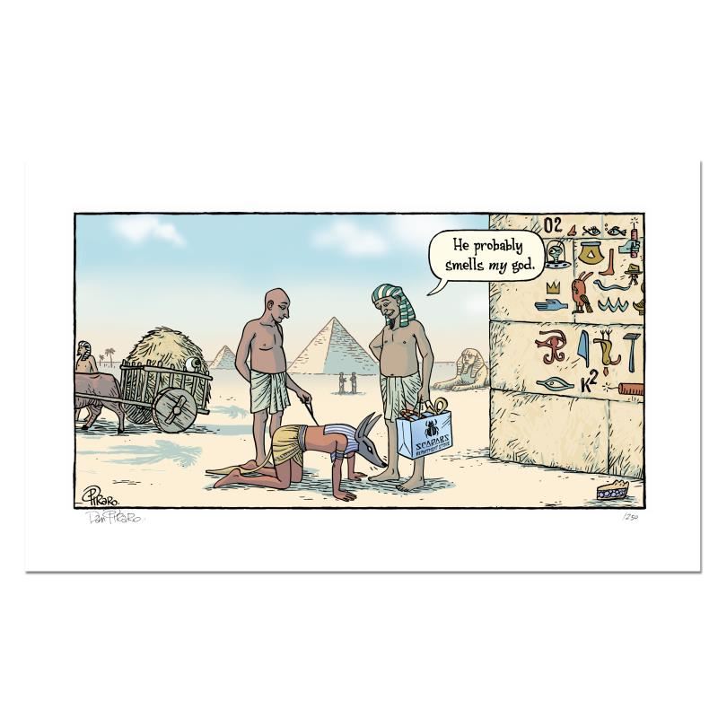 "Egypt Dog" is a limited edition giclee on paper by Dan Piraro, creator of the critically acclaimed and award winning comic strip, Bizarro! This piece is numbered and hand signed by the artist and includes aletterof authenticity. Measures approximtely 8" x 15" (image).