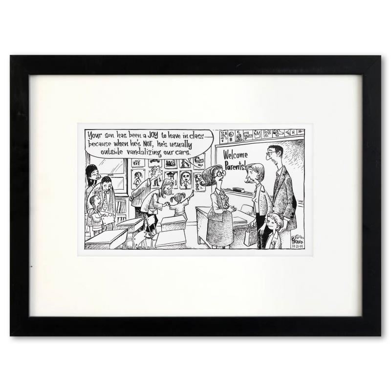 Enter a surreal and satirical world of twisted imagination and award winning creativity. "Joy to Have in Class" is an original pen & ink drawing on paper by Dan Piraro, creator of the critically acclaimed and award winning comic strip, Bizarro. This piece is hand signed, comes custom framed and includes a letter of authenticity. Measures approximately 14" x 21" (frame), 7" x 13" (image).This item requires special handling and may have a longer than usual turnaround.