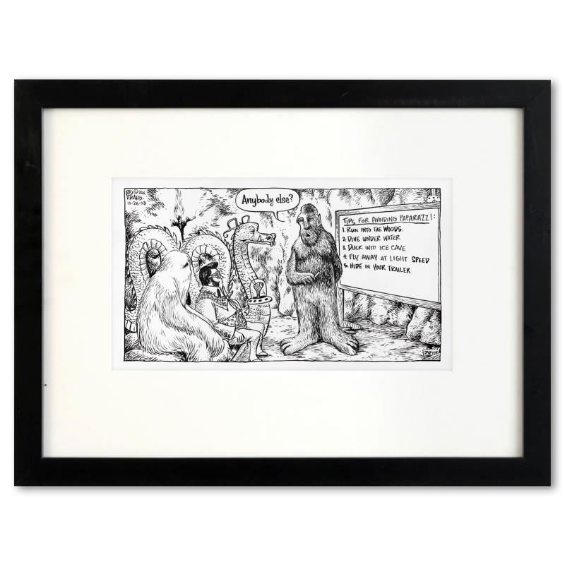 Enter a surreal and satirical world of twisted imagination and award winning creativity. "Legend Meeting" is an original pen & ink drawing on paper by Dan Piraro, creator of the critically acclaimed and award winning comic strip, Bizarro. This piece is hand signed, comes custom framed and includes a letter of authenticity. Measures approximately 14" x 21" (frame), 7" x 13" (image).This item requires special handling and may have a longer than usual turnaround.
