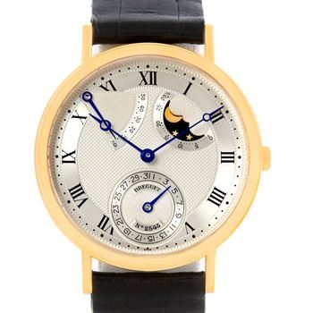 One Breguet Classique Power Reserve 18K Yellow Gold Watch. The watch is in excellent condition and the details are as follows: Model: 3137BA/11/986, Movement: Automatic self-winding movement. Case: 18K yellow gold case 36.0 mm in diameter. Transparent case back. Crystal: Scratch resistant sapphire crystal. Dial: Hand engraved (engine-turned) silver dial with roman numerals. Blued Breguet style hands. Power reserve indicator between 10 and 11 o'clock, Moonphase window between 12 and 3, date sub-dial indicator at 6 o'clock position. Bracelet: Black leather strap with 18K yellow gold buckle.