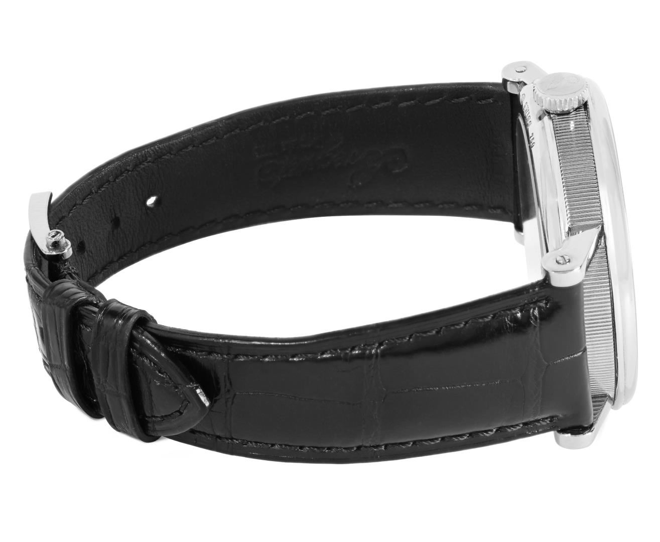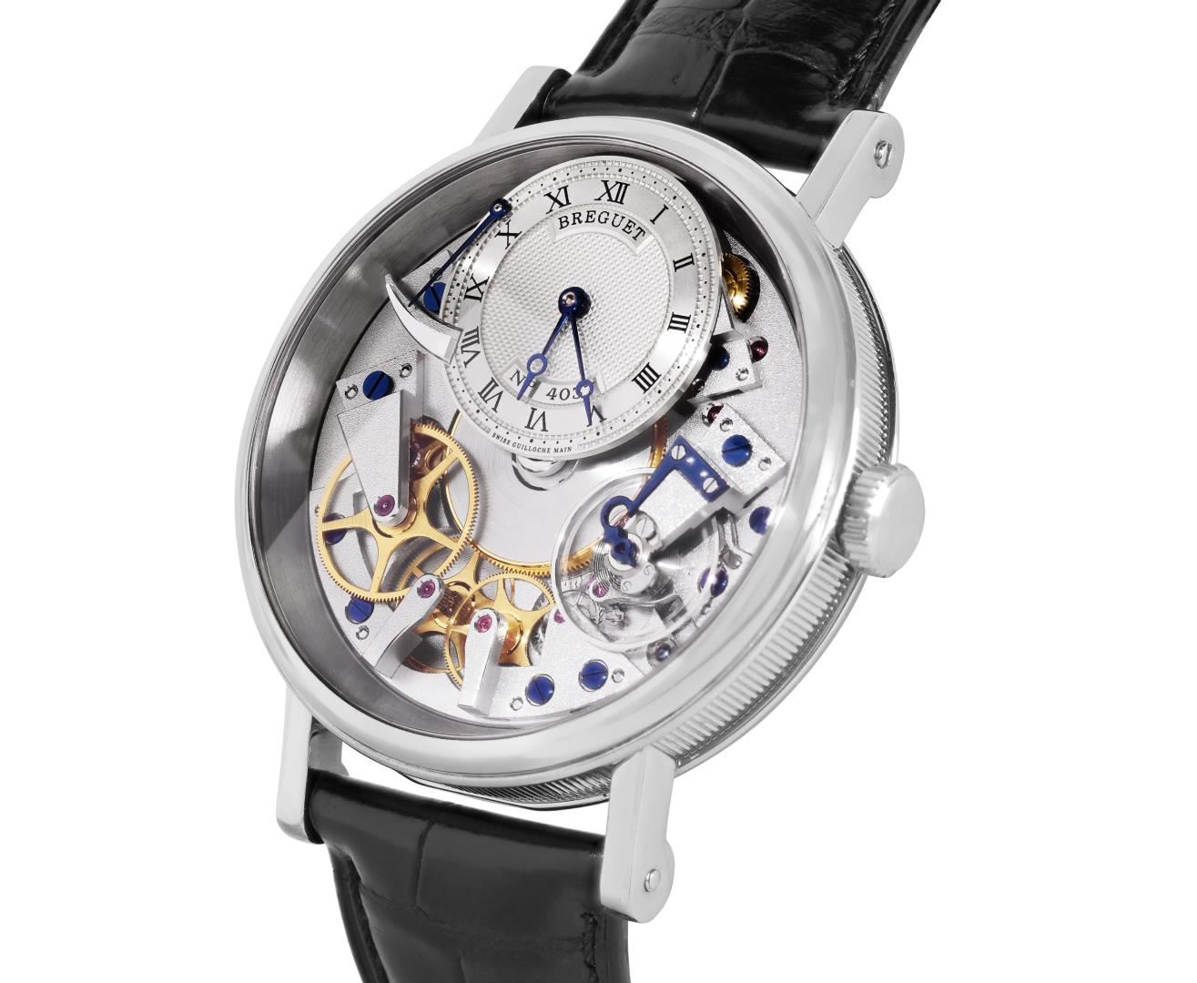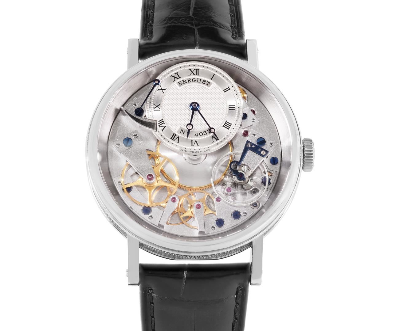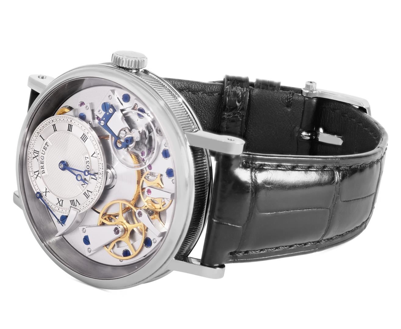 One Mens Pre Owned 18K White Gold Breguet Tradition, Polished & Electronically Tested. Breguet 18K White Gold Case: 40MM Case, Breguet White Gold Crown, Breguet Sapphire Crystal. Breguet Manual Winding Mechanical Movement. Breguet Dial: Factory Silver Dial With Roman Hour Markers. Blue Breguet Hands. Model: White Gold Breguet Tradition, Functions: Exposition Backcase, Power Reserve Display. Condition: G-6 Extra Fine. Breguet Band: Alligator Leather Band With 18K Breguet White Clasp. Bright Polish & Satin Finish. 7.5 Inch Length. This Watch Has Been Polished And Tested It Is Free of All Scratches And Dents.