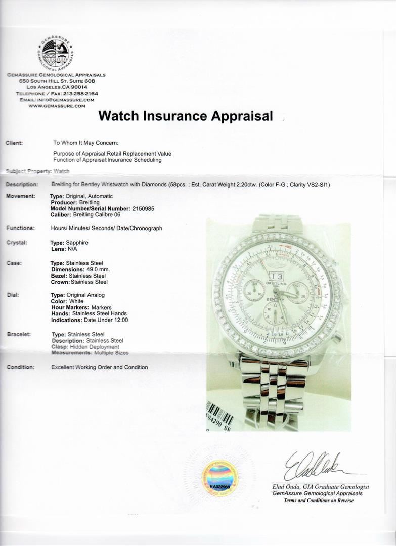 One Breitling Bentley Stainless Steel and Diamond Wristwatch. 58 diamonds with a total weight of 2.20cts with a color of (F-G) and clarity of VS2-SI1). 49mm case. Chronograph functions include hours, minutes, seconds, and date. GGA Appraised.