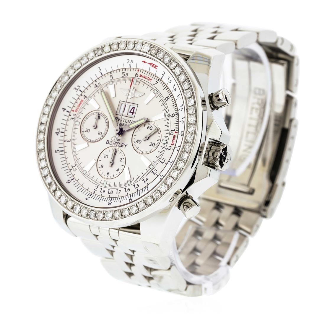 One Breitling Bentley Stainless Steel and Diamond Wristwatch. 58 diamonds with a total weight of 2.20cts with a color of (F-G) and clarity of VS2-SI1). 49mm case. Chronograph functions include hours, minutes, seconds, and date. GGA Appraised.