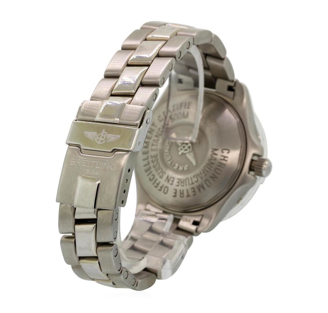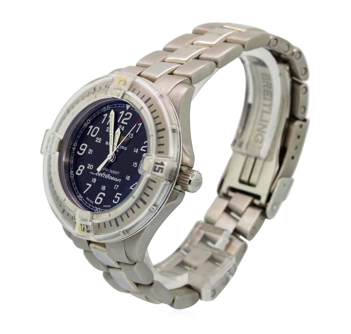 The Specifications are as follows: Model: Breitling Colt Ocean Reference Number A64350, Gender: Men's, Dial: Black Luminous Arabic Numeral Dial with Luminous Hands, Bezel: Unidirectional Rotatable Stainless Steel Bezel, Case: Stainless Steel 38mm, Movement: Quartz, Bracelet: Stainless Steel with Deployant Clasp, Crystal: Sapphire, the watch comes complete with original Box and Papers.