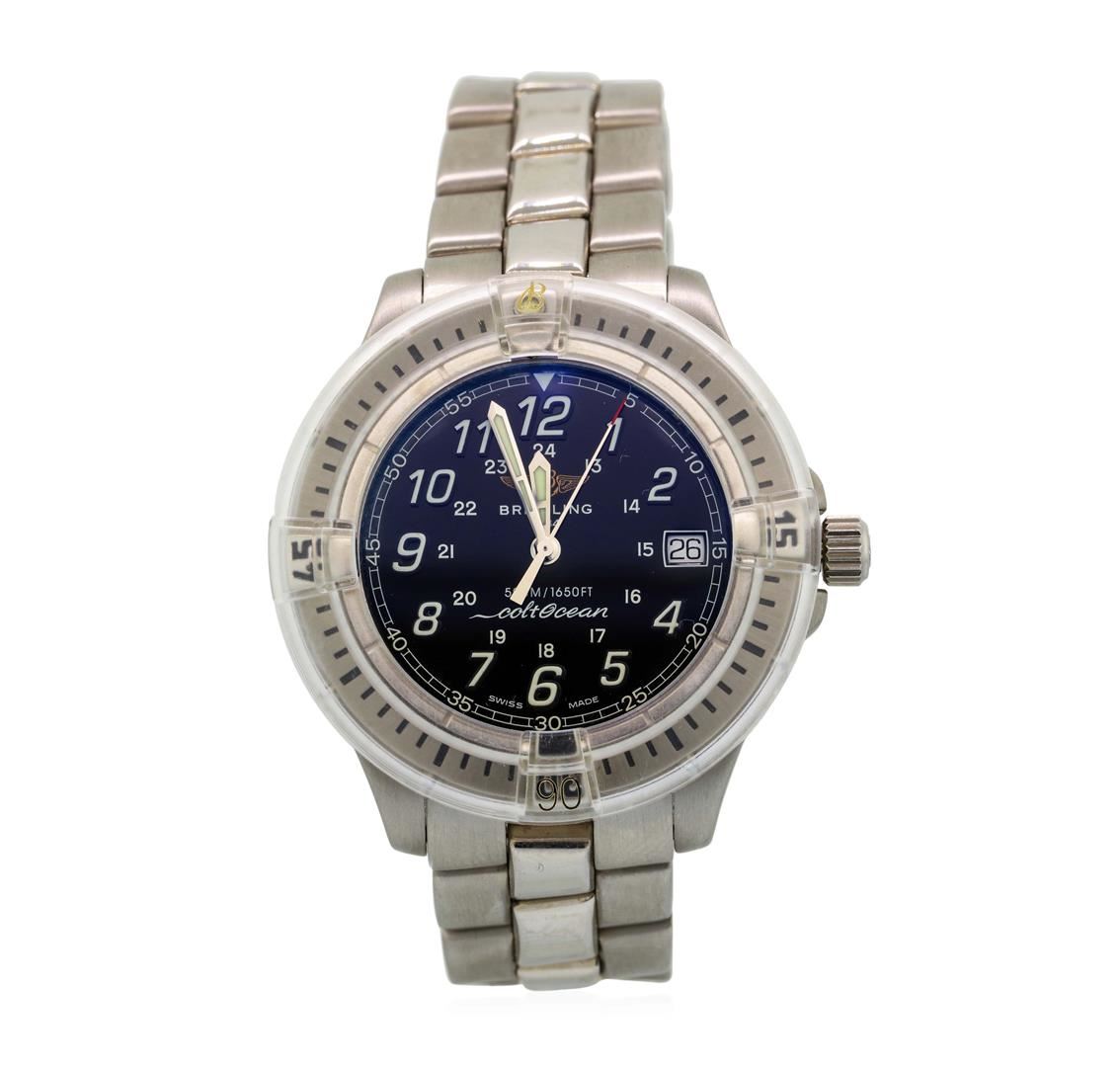 The Specifications are as follows: Model: Breitling Colt Ocean Reference Number A64350, Gender: Men's, Dial: Black Luminous Arabic Numeral Dial with Luminous Hands, Bezel: Unidirectional Rotatable Stainless Steel Bezel, Case: Stainless Steel 38mm, Movement: Quartz, Bracelet: Stainless Steel with Deployant Clasp, Crystal: Sapphire, the watch comes complete with original Box and Papers.
