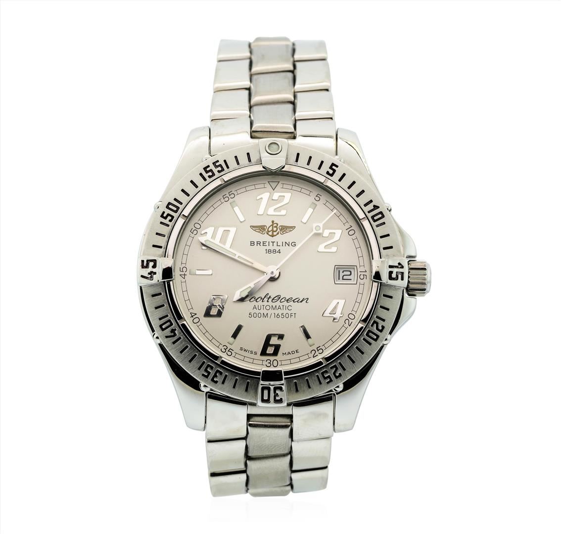 Breitling Colt Ocean Stainless Steel Watch. This watch in in good condition and contains the following attributes: Case: Stainless Steel 38mm, Dial: White Arabic Dial with date wheel indicator and Luminous hands, Crystal: Sapphire Crystal, Bezel: Rotating Stainless Steel Bezel, Bracelet: Stainless Steel with flip lock clasp.