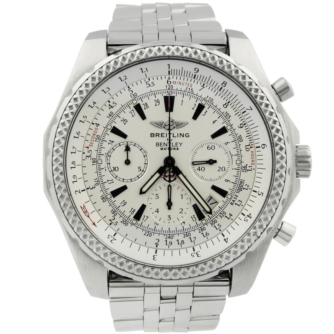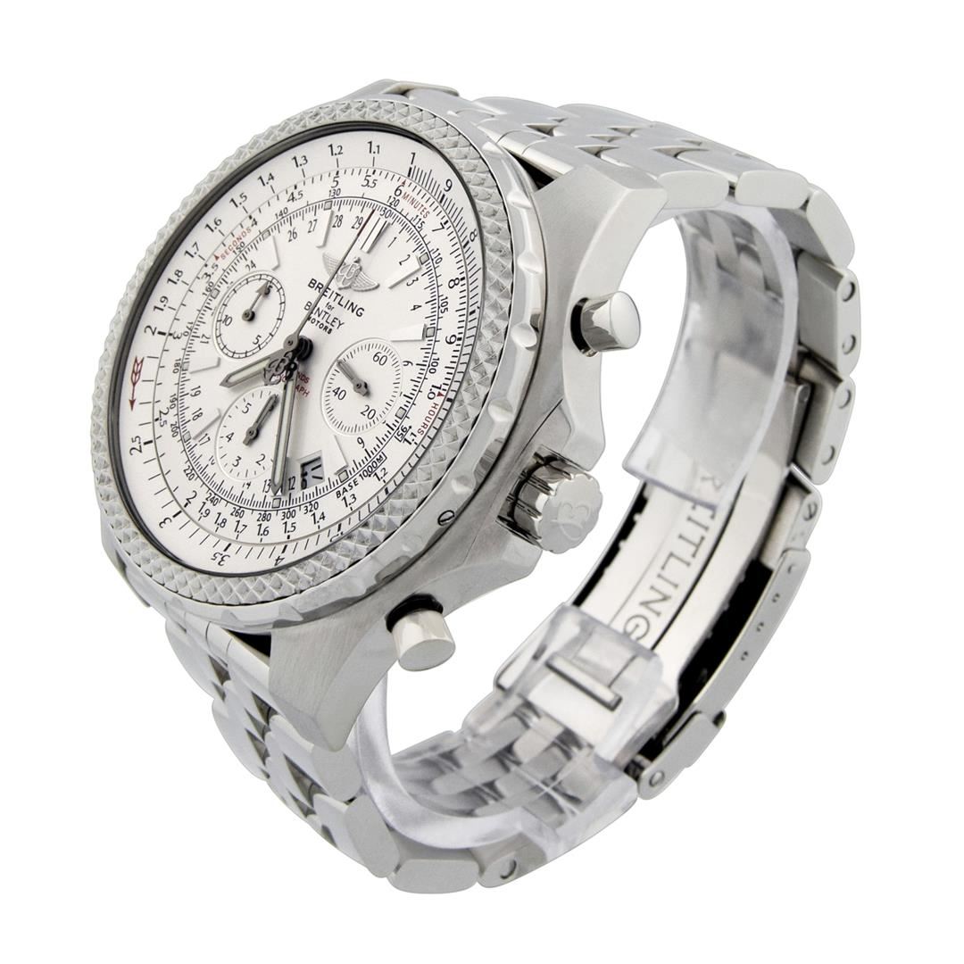 Breitling Bentley Motors T Mens 49mm White Dial Steel Polished & Electronically Tested. Model: Bentley Motors T A25363, Steel. Case: Stainless Steel. Bezel: Bi-rotational Steel Bezel. Crystal: Sapphire Crystal. Bracelet: Stainless Steel. Dial: White Color. Date Window: Between 4 and 5 O'clock Position. Movement: Automatic Winding Movement. Water Resistant: Yes. Case Size: 49mm. Condition: Pre Owned, Watch is free of all Scratches and Dents, Near Mint G-7.