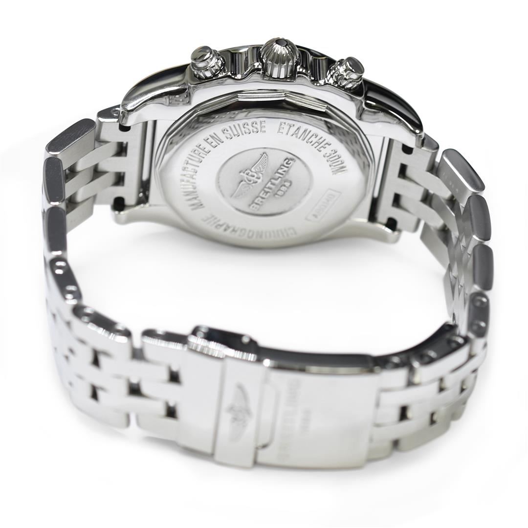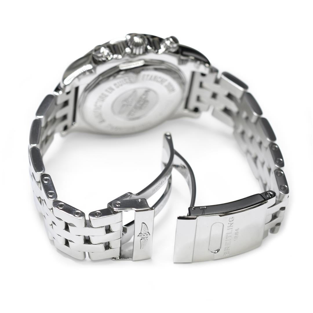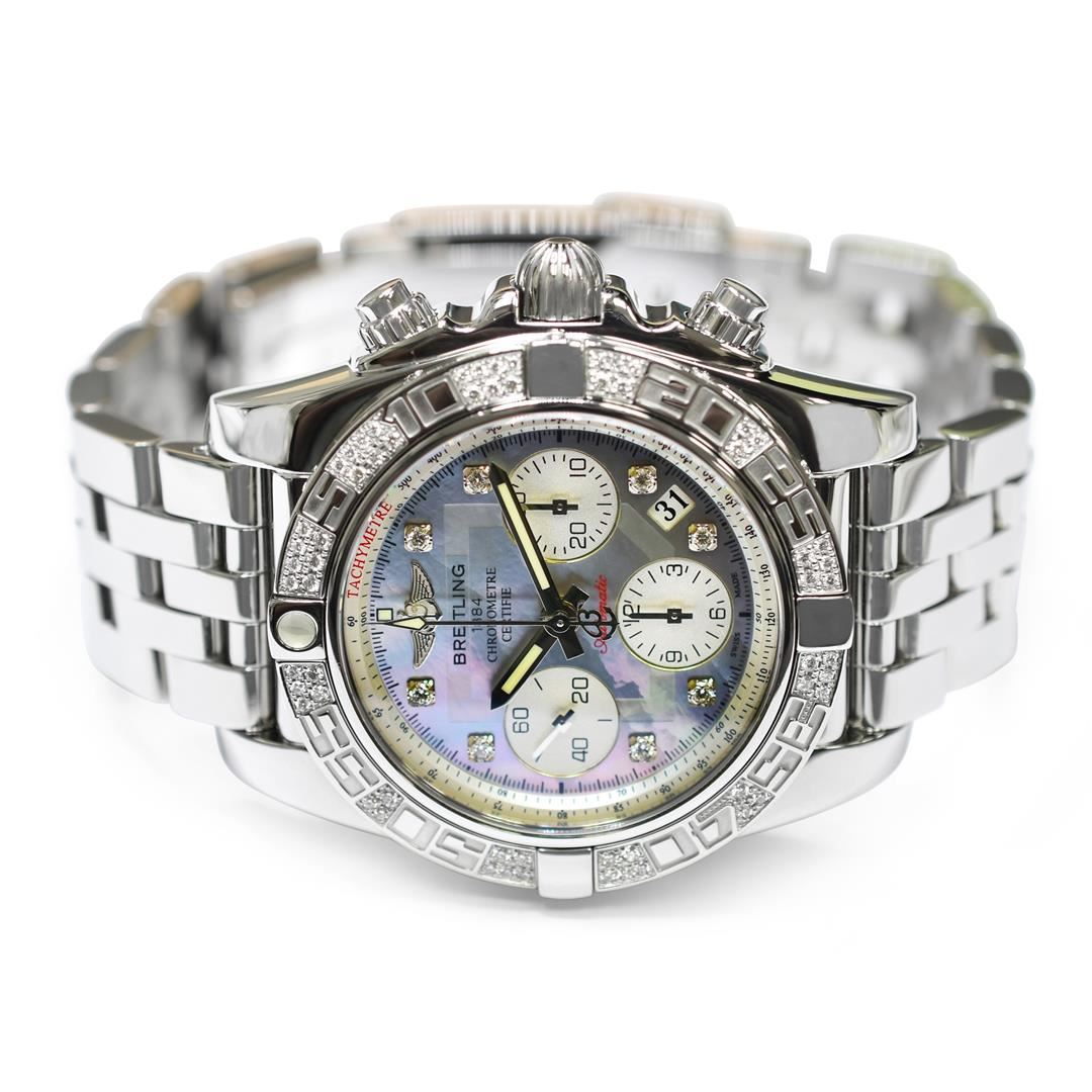 Breitling Mens Chronomat Stainless Steel 41mm Mother of Pearl Diamond Dial Watch Polished & Electronically Tested. Model: Chronomat AB0140. Case: Stainless Steel. Bezel: Custom made diamond bezel with round brilliant diamonds all set in prong setting. Total Diamond Weight: 0.80ctw. Clarity: VS-SI Color: G-H. Crystal: Sapphire Crystal. Bracelet: Stainless Steel. Dial: Mother of Pearl Diamond Dial. Date Window: Between 4-5 O'clock Position. Movement: Automatic Winding Movement. Water Resistant: Yes. Case Size: . Condition: Pre Owned, Watch is free of all Scratches and Dents, Extra Fine G-6.