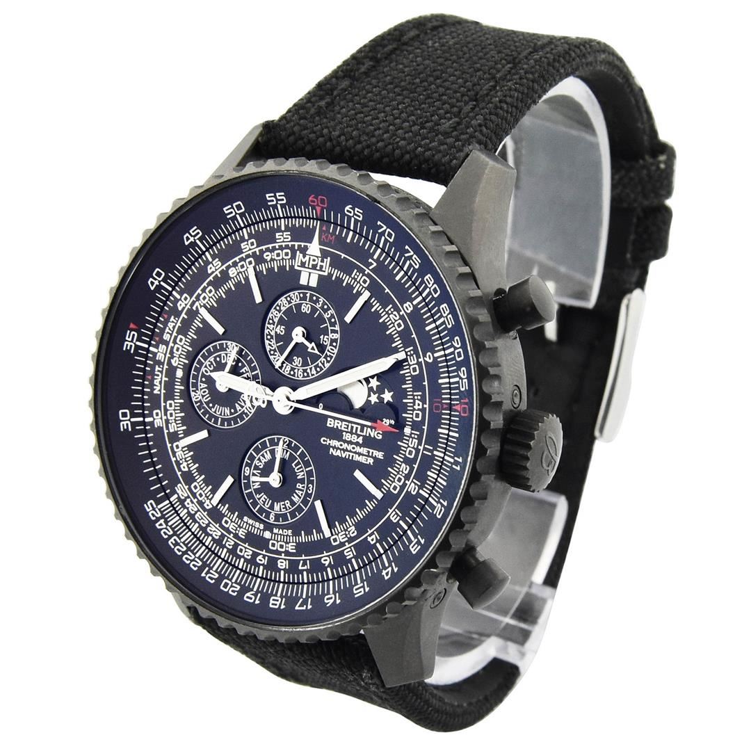 Breitling Mens Navitimer Stainless Steel 48mm Black Dial Watch Polished & Electronically Tested. Model: Navitimer. Case: Stainless Steel. Crystal: Sapphire Crystal. Bracelet: Canvas Strap. Dial: Black Dial. Movement: Automatic Winding Movement. Water Resistant: Yes. Case Size: 48mm. Condition: Pre Owned, Watch is free of all Scratches and Dents, Near Mint G-7.