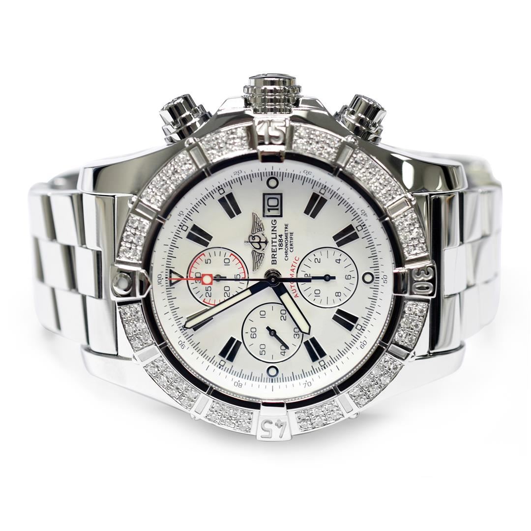 Breitling Super Avenger Mens 48mm White Dial Steel Polished & Electronically Tested. Model: Super Avenger A13370, Steel. Case: Stainless Steel. Bezel: Custom made diamond bezel with round brilliant diamonds all set in prong setting. Total Weight 2.00ctw Clarity: VS-SI Color:G-H. Crystal: Sapphire Crystal. Bracelet: Stainless Steel. Dial: White Dial. Date Window: 3 O'clock Position. Movement: Automatic Winding Movement. Water Resistant: Yes. Case Size: 48mm. Condition: Pre Owned, Watch is free of all Scratches and Dents, Near Mint G-7.