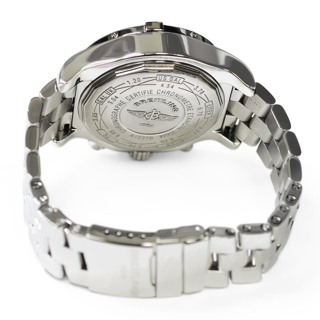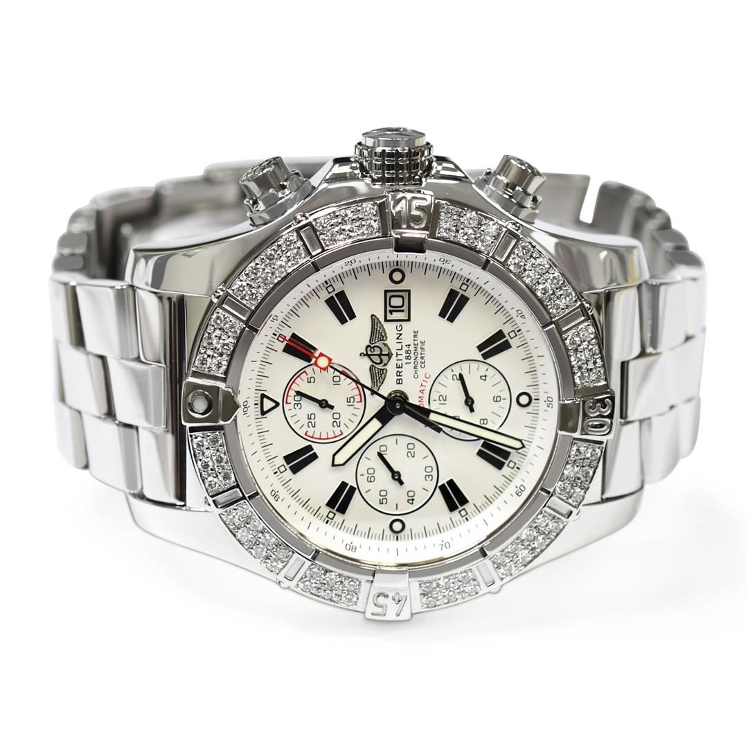 Breitling Mens Super Avenger Stainless Steel 48mm White Stick Dial Watch Polished & Electronically Tested. Model: Super Avenger, A13370. Case: Stainless Steel. Bezel: Custom made diamond bezel with round brilliant diamonds all set in prong setting. Total Diamond Weight: 0.90ctw. Clarity: VS-SI Color: G-H. Crystal: Sapphire Crystal. Bracelet: Stainless Steel. Dial: White Dial. Date Window: 3 O'clock Position. Movement: Automatic Winding Movement. Water Resistant: Yes. Case Size: 48mm. Condition: Pre Owned, Watch is free of all Scratches and Dents, Extra Fine G-6.