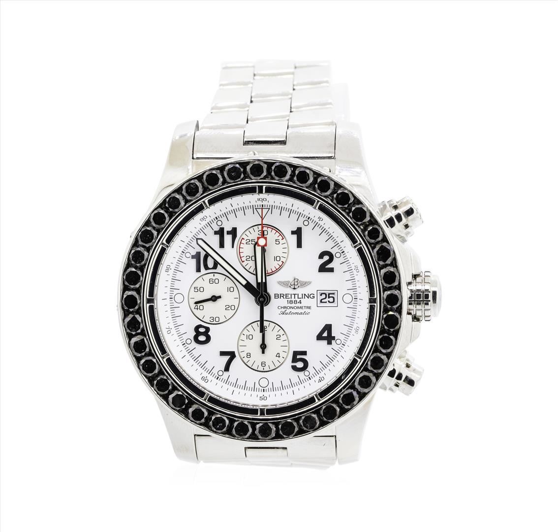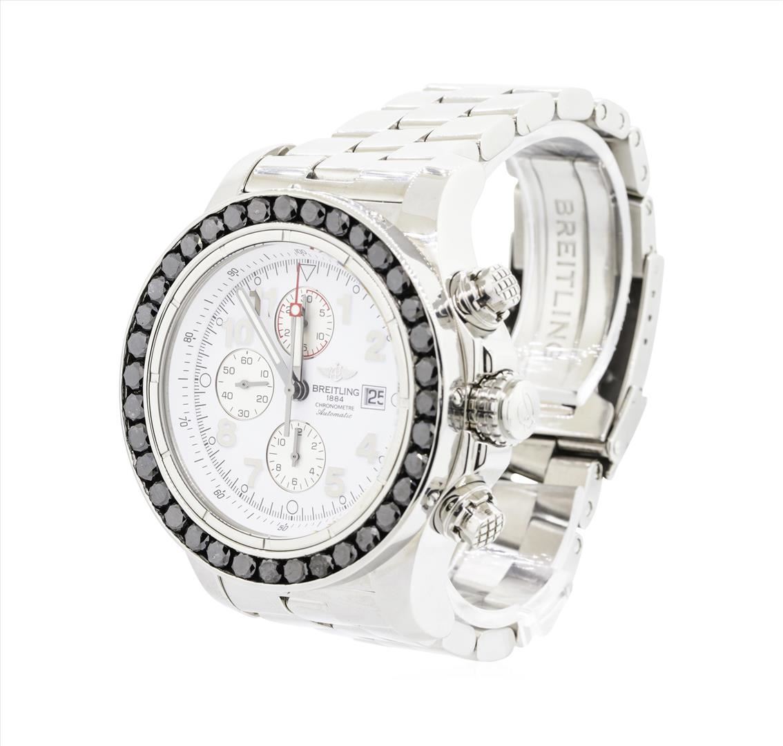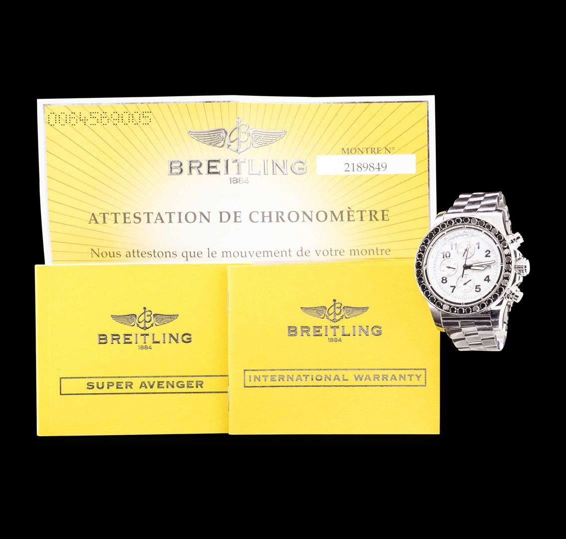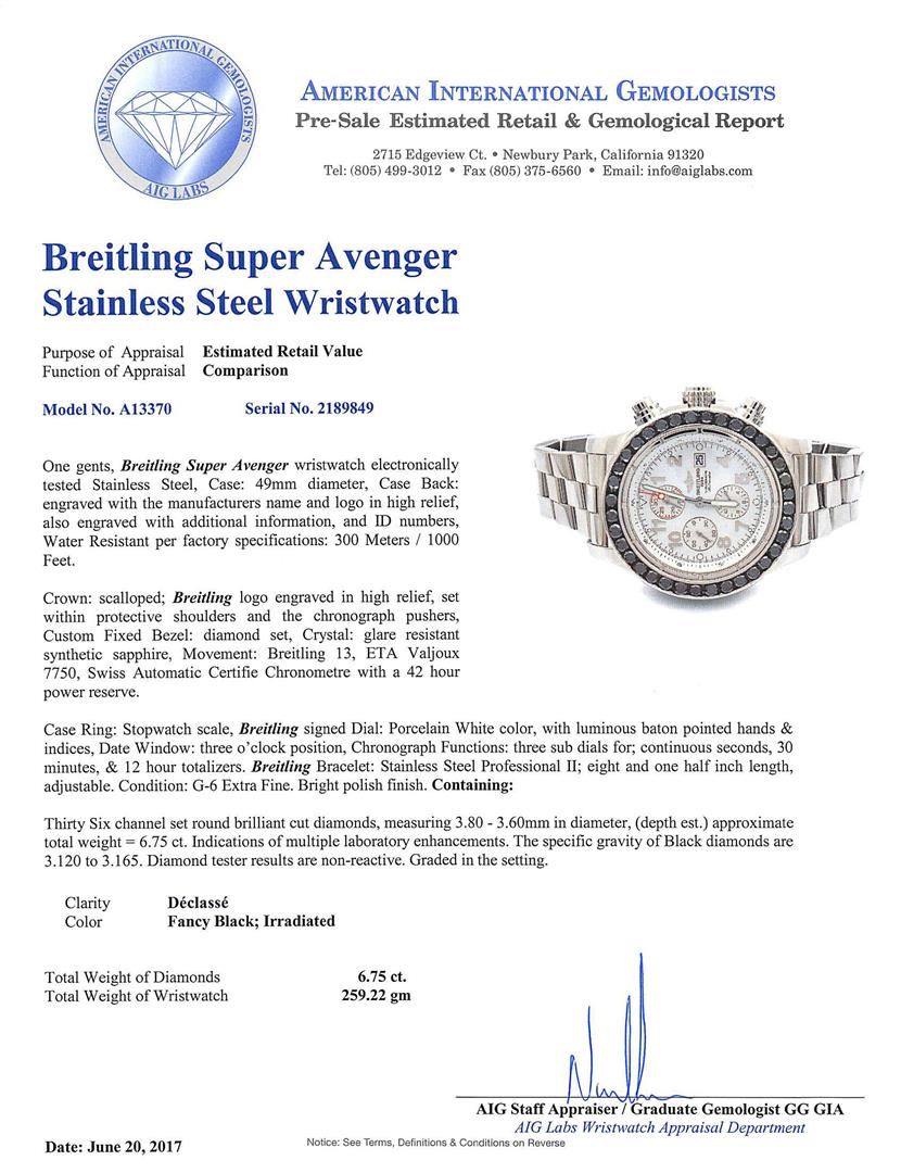 One gents, Breitling Super Avenger wristwatch electronically tested Stainless Steel, Case: 49mm diameter, Case Back: engraved with the manufacturers name and logo in high relief, also engraved with additional information, and ID numbers, Water Resistant per factory specifications: 300 Meters / 1000 Feet. Crown: scalloped; Breitling logo engraved in high relief, set within protective shoulders and the chronograph pushers, Custom Fixed Bezel: diamond set, Crystal: glare resistant synthetic sapphire, Movement: Breitling 13, ETA Valjoux 7750, Swiss Automatic Certifie Chronometre with a 42 hour power reserve. Case Ring: Stopwatch scale, Breitling signed Dial: Porcelain White color, with luminous baton pointed hands & indices, Date Window: three o'clock position, Chronograph Functions: three sub dials for; continuous seconds, 30 minutes, & 12 hour totalizers. Breitling Bracelet: Stainless Steel Professional II; eight and one half inch length, adjustable. Condition: G-6 Extra Fine. Bright polish finish. Containing: Thirty Six channel set round brilliant cut diamonds, measuring 3.80 - 3.60mm in diameter, (depth est.) approximate total weight = 6.75ct. Indications of multiple laboratory enhancements. The specific gravity of Black diamond is 3.120 to 3.165. Diamond tester results are non-reactive. Graded in the setting. Clarity D,class,. Color: Fancy Black; IrradiatedTotal Weight of Diamonds 6.75ct. Total Weight of Wristwatch 259.22gm. AIG Appraised.