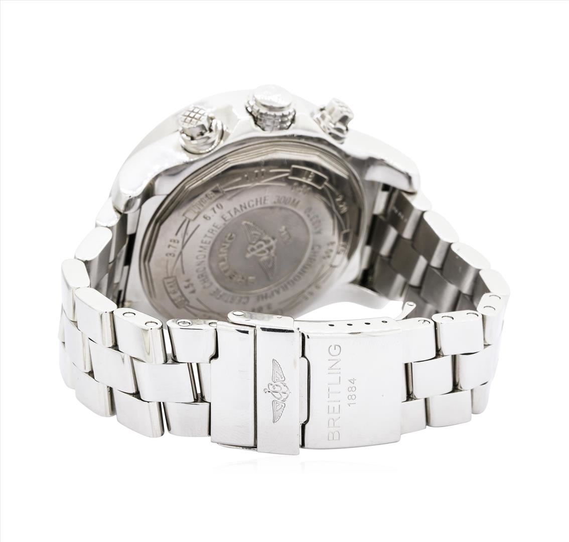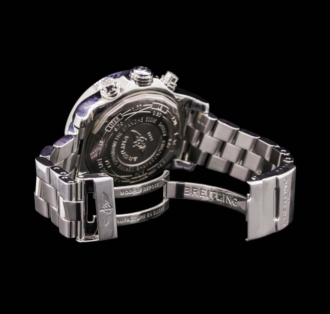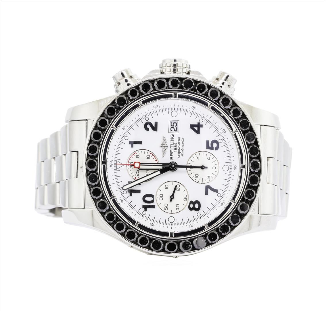 One gents, Breitling Super Avenger wristwatch electronically tested Stainless Steel, Case: 49mm diameter, Case Back: engraved with the manufacturers name and logo in high relief, also engraved with additional information, and ID numbers, Water Resistant per factory specifications: 300 Meters / 1000 Feet. Crown: scalloped; Breitling logo engraved in high relief, set within protective shoulders and the chronograph pushers, Custom Fixed Bezel: diamond set, Crystal: glare resistant synthetic sapphire, Movement: Breitling 13, ETA Valjoux 7750, Swiss Automatic Certifie Chronometre with a 42 hour power reserve. Case Ring: Stopwatch scale, Breitling signed Dial: Porcelain White color, with luminous baton pointed hands & indices, Date Window: three o'clock position, Chronograph Functions: three sub dials for; continuous seconds, 30 minutes, & 12 hour totalizers. Breitling Bracelet: Stainless Steel Professional II; eight and one half inch length, adjustable. Condition: G-6 Extra Fine. Bright polish finish. Containing: Thirty Six channel set round brilliant cut diamonds, measuring 3.80 - 3.60mm in diameter, (depth est.) approximate total weight = 6.75ct. Indications of multiple laboratory enhancements. The specific gravity of Black diamond is 3.120 to 3.165. Diamond tester results are non-reactive. Graded in the setting. Clarity D,class,. Color: Fancy Black; IrradiatedTotal Weight of Diamonds 6.75ct. Total Weight of Wristwatch 259.22gm. AIG Appraised.