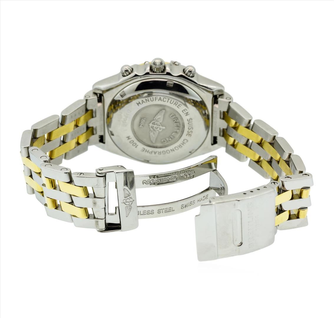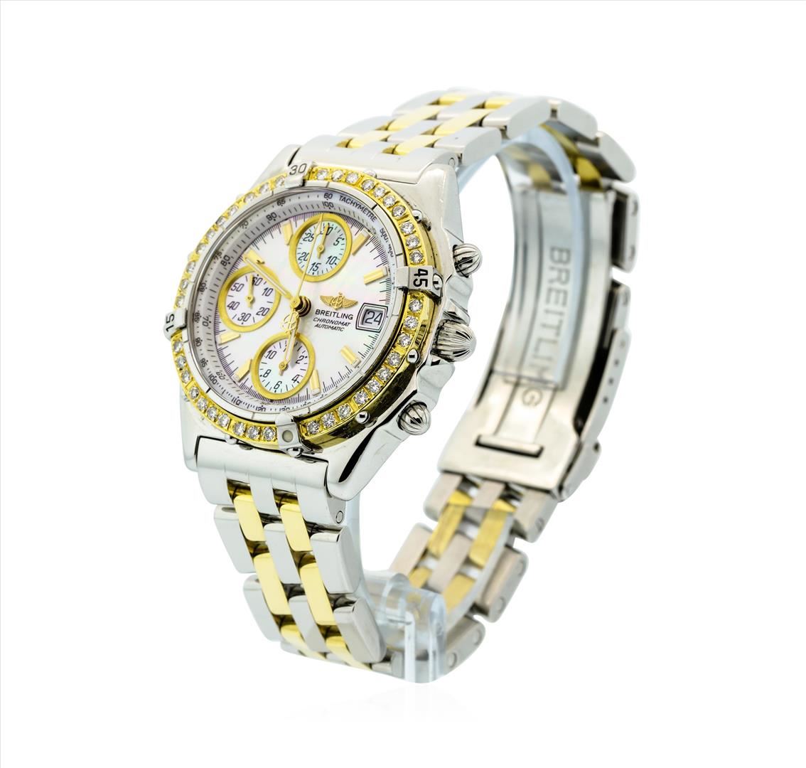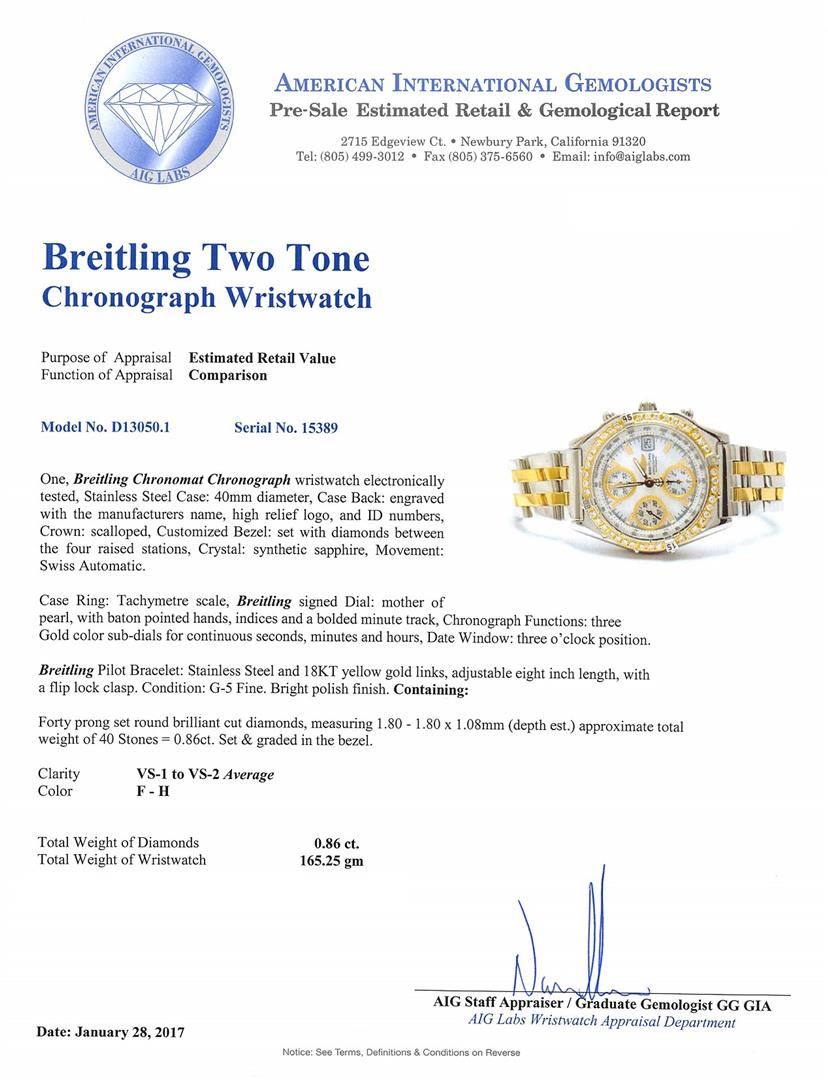 One, Breitling Chronomat Chronograph wristwatch electronically tested, Stainless Steel Case: 40mm diameter, Case Back: engraved with the manufacturers name, high relief logo, and ID numbers, Crown: scalloped, Customized Bezel: set with diamonds between the four raised stations, Crystal: synthetic sapphire, Movement: Swiss Automatic. Case Ring: Tachymetre scale, Breitling signed Dial: mother of pearl, with baton pointed hands, indices and a bolded minute track, Chronograph Functions: three Gold color sub-dials for continuous seconds, minutes and hours, Date Window: three o'clock position. Breitling Pilot Bracelet: Stainless Steel and 18KT yellow gold links, adjustable eight inch length, with a flip lock clasp. Condition: G-5 Fine. Bright polish finish. Containing: Forty prong set round brilliant cut diamonds, measuring 1.80 - 1.80 x 1.08mm (depth est.) approximate total weight of 40 Stones = 0.86ct. Set & graded in the bezel. Clarity: VS-1 to VS-2 Average. Color: F - H. Total Weight of Diamonds 0.86ct. Total Weight of Wristwatch 165.25gm. AIG Appraised.