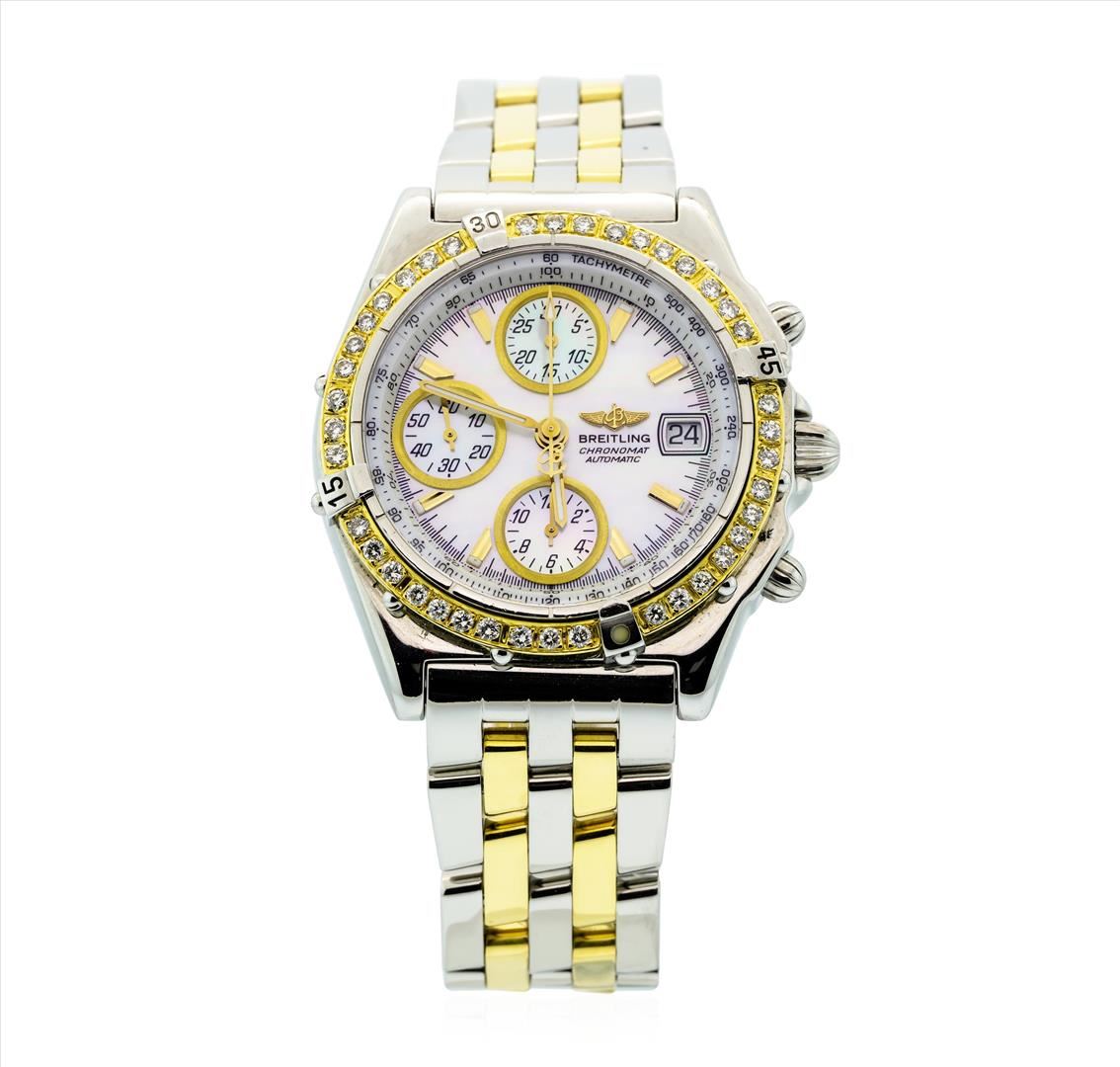 One, Breitling Chronomat Chronograph wristwatch electronically tested, Stainless Steel Case: 40mm diameter, Case Back: engraved with the manufacturers name, high relief logo, and ID numbers, Crown: scalloped, Customized Bezel: set with diamonds between the four raised stations, Crystal: synthetic sapphire, Movement: Swiss Automatic. Case Ring: Tachymetre scale, Breitling signed Dial: mother of pearl, with baton pointed hands, indices and a bolded minute track, Chronograph Functions: three Gold color sub-dials for continuous seconds, minutes and hours, Date Window: three o'clock position. Breitling Pilot Bracelet: Stainless Steel and 18KT yellow gold links, adjustable eight inch length, with a flip lock clasp. Condition: G-5 Fine. Bright polish finish. Containing: Forty prong set round brilliant cut diamonds, measuring 1.80 - 1.80 x 1.08mm (depth est.) approximate total weight of 40 Stones = 0.86ct. Set & graded in the bezel. Clarity: VS-1 to VS-2 Average. Color: F - H. Total Weight of Diamonds 0.86ct. Total Weight of Wristwatch 165.25gm. AIG Appraised.