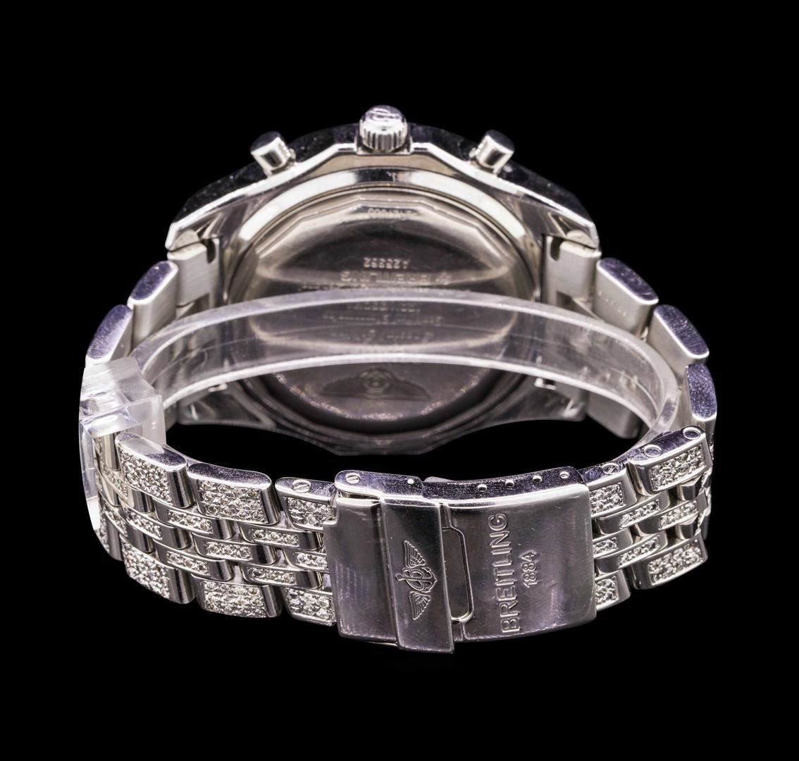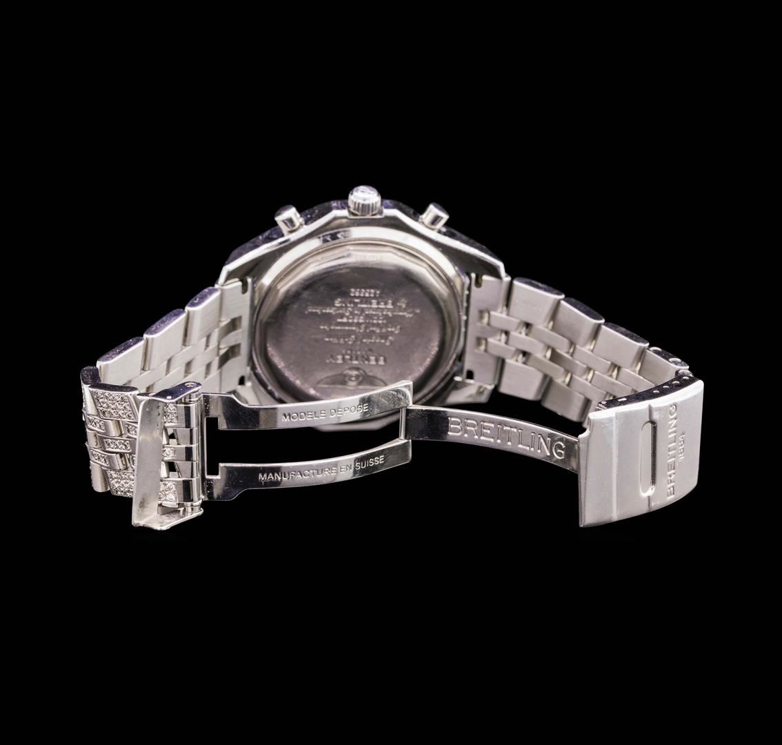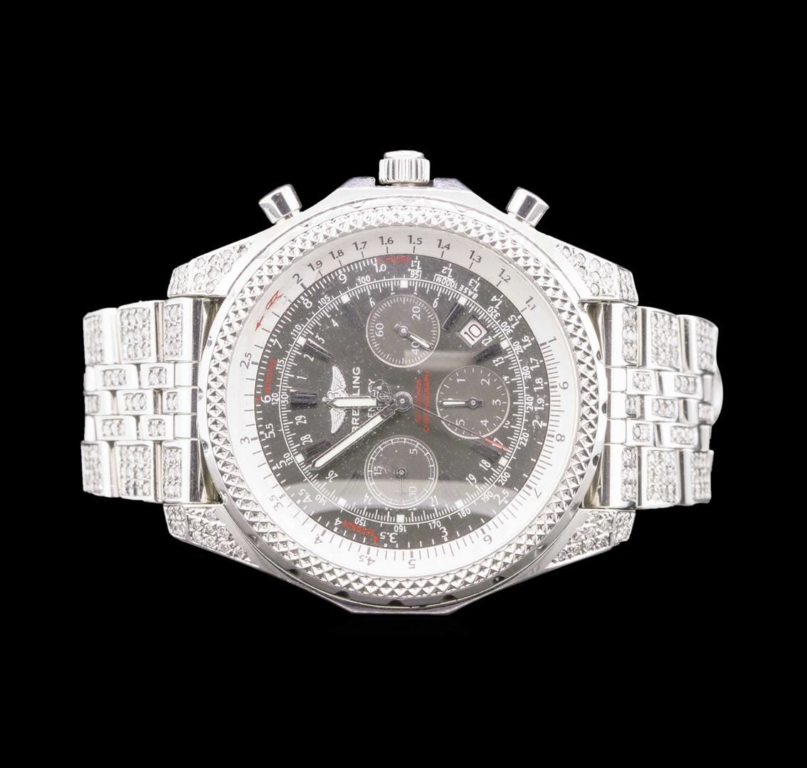 One gents, Breitling for Bentley Motors Chronograph wristwatch electronically tested Stainless Steel, Case: 48mm diameter, Case Back: engraved with the manufacturers logo, name, model name, and ID information, Customized Case lugs: set with diamonds, bi-directional rotating Knurled Bezel: Logo'd Crown: locking, set within protective shoulders, Crystal: synthetic Sapphire.Movement: Swiss Automatic, Power Reserve: 42 hours, Breitling signed Dial: Black color, with luminous baton pointed hands, indices and a second hand counter with the Breitling logo at the bottom, Date Window: between the 4 and 5 o'clock position. Chronograph: 15 minute counter sub-dial located at the 9 o'clock position, 6 hour counter sub-dial located at the 6 o'clock position, continuous small seconds hand sub-dial located at the 3 o'clock position. Customized Breitling Speed Bracelet: set throughout with diamonds, eight inch length. Breitling concealed deployment clasp. Condition: G-5 Fine. Containing:Approximately Three Hundred Sixty Five burnish set round brilliant cut diamonds, measuring an average of 1.55mm in diameter, approximate total weight = 5.00ct. Clarity VS-2 to SI-1 AverageColor F - H. Total Weight of Diamonds 5.00ct. Total Weight of Wristwatch 203.27gm. AIG Appraised.
