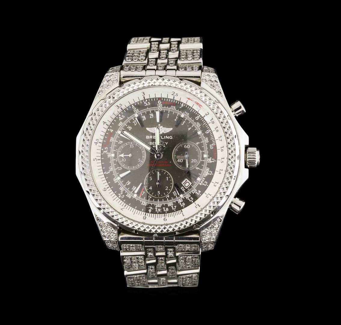 One gents, Breitling for Bentley Motors Chronograph wristwatch electronically tested Stainless Steel, Case: 48mm diameter, Case Back: engraved with the manufacturers logo, name, model name, and ID information, Customized Case lugs: set with diamonds, bi-directional rotating Knurled Bezel: Logo'd Crown: locking, set within protective shoulders, Crystal: synthetic Sapphire.Movement: Swiss Automatic, Power Reserve: 42 hours, Breitling signed Dial: Black color, with luminous baton pointed hands, indices and a second hand counter with the Breitling logo at the bottom, Date Window: between the 4 and 5 o'clock position. Chronograph: 15 minute counter sub-dial located at the 9 o'clock position, 6 hour counter sub-dial located at the 6 o'clock position, continuous small seconds hand sub-dial located at the 3 o'clock position. Customized Breitling Speed Bracelet: set throughout with diamonds, eight inch length. Breitling concealed deployment clasp. Condition: G-5 Fine. Containing:Approximately Three Hundred Sixty Five burnish set round brilliant cut diamonds, measuring an average of 1.55mm in diameter, approximate total weight = 5.00ct. Clarity VS-2 to SI-1 AverageColor F - H. Total Weight of Diamonds 5.00ct. Total Weight of Wristwatch 203.27gm. AIG Appraised.