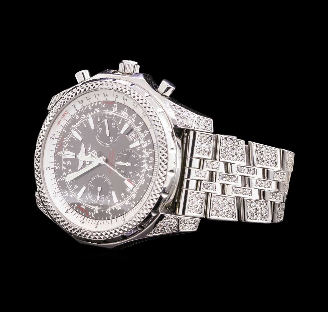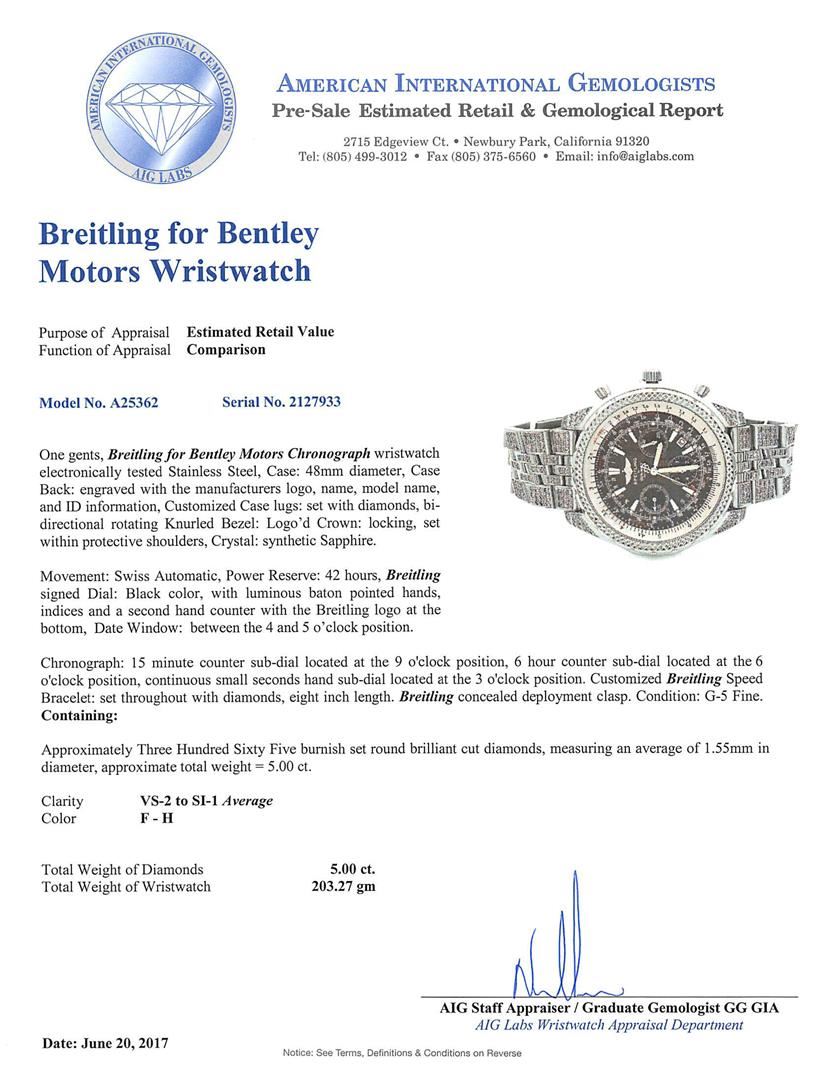 One gents, Breitling for Bentley Motors Chronograph wristwatch electronically tested Stainless Steel, Case: 48mm diameter, Case Back: engraved with the manufacturers logo, name, model name, and ID information, Customized Case lugs: set with diamonds, bi-directional rotating Knurled Bezel: Logo'd Crown: locking, set within protective shoulders, Crystal: synthetic Sapphire.Movement: Swiss Automatic, Power Reserve: 42 hours, Breitling signed Dial: Black color, with luminous baton pointed hands, indices and a second hand counter with the Breitling logo at the bottom, Date Window: between the 4 and 5 o'clock position. Chronograph: 15 minute counter sub-dial located at the 9 o'clock position, 6 hour counter sub-dial located at the 6 o'clock position, continuous small seconds hand sub-dial located at the 3 o'clock position. Customized Breitling Speed Bracelet: set throughout with diamonds, eight inch length. Breitling concealed deployment clasp. Condition: G-5 Fine. Containing:Approximately Three Hundred Sixty Five burnish set round brilliant cut diamonds, measuring an average of 1.55mm in diameter, approximate total weight = 5.00ct. Clarity VS-2 to SI-1 AverageColor F - H. Total Weight of Diamonds 5.00ct. Total Weight of Wristwatch 203.27gm. AIG Appraised.