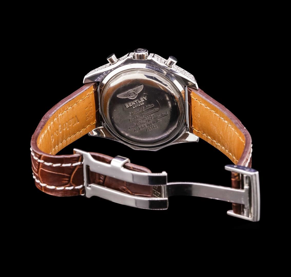 One gents, Breitling for Bentley Motors Chronograph wristwatch electronically tested Stainless Steel, Case: 48mm diameter, Case Back: engraved with the manufacturers logo, name, model name, and ID information, Customized Case shoulders and case lugs: set with diamonds, non-rotating Knurled Bezel: Logo'd Crown: locking, set within protective shoulders, Crystal: synthetic Sapphire.Movement: Swiss Automatic, Power Reserve: 42 hours, Breitling signed Dial: Bronze color, with luminous baton pointed hands, indices and a second hand counter with the Breitling logo at the bottom, Date Window: between the 4 and 5 o'clock position. Chronograph: 30 minute counter sub-dial located at the 9 o'clock position, 6 hour counter sub-dial located at the 6 o'clock position, continuous small seconds hand sub-dial located at the 3 o'clock position. Bracelet: saddle stitched leather strap, nine inch length. Condition: G-5 Fine. Containing:Approximately One Hundred Thirty One burnish set round brilliant cut diamonds, measuring an average of 1.60mm in diameter, approximate total weight = 2.00ct. Clarity VS-2 to SI-1 AverageColor G - H. Total Weight of Diamonds 2.00ct. Total Weight of Wristwatch 146.70gm. AIG Appraised.