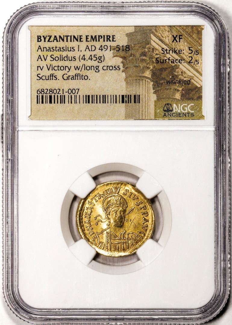 One Byzantine Empire 491-518 AD Anastasius I AV Solidus Ancient Gold Coin NGC XF. NGC Certified.