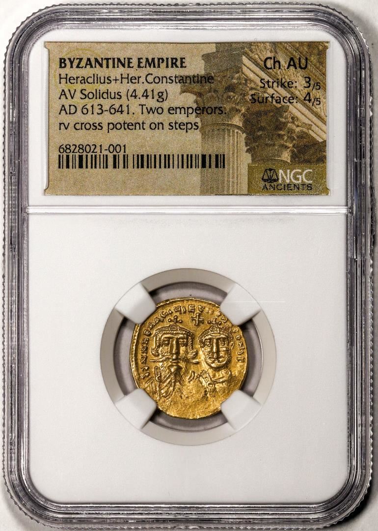 One Byzantine Empire 613-641 AD Heraclius + Her. Constantine AV Solidus Gold Coin NGC Ch AU. NGC Certified.